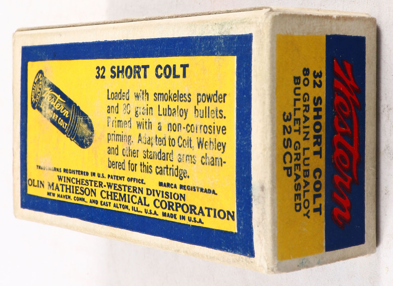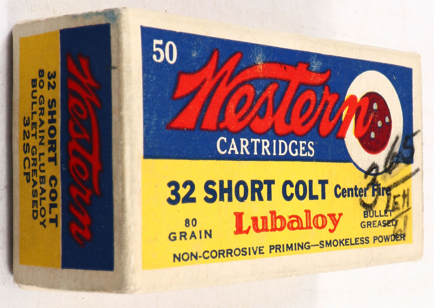 Western, .32 Short Colt, 80 Grain Lubaloy Bullet, Full, 1pc. Blue yellow & red bulls eye box, box is very solid with excellent color, has writing on box, very minor shelf wear, corners are mostly sharp, edges are crisp, ammo is excellent. Grade: Excellent + - Value: 30 to 90