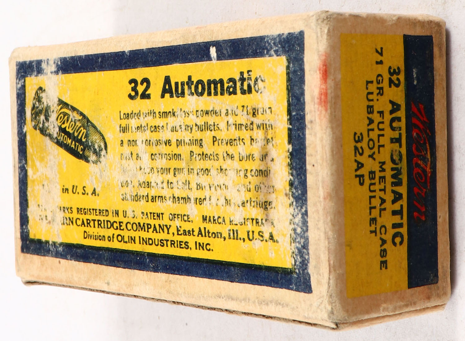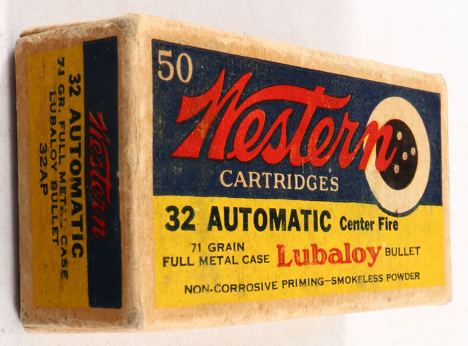 Western, .32 Automatic, 71 Grain Full Metal Case Lubaloy Bullet, Partial 43rds., 1pc. Blue yellow & red bulls eye box, box is solid with very good color, some age soiling, very minor shelf & corner wear, edges are mostly crisp, end flaps are solid, ammo is very good to excellent. Grade: Very Good ++ - Value: 10 to 40