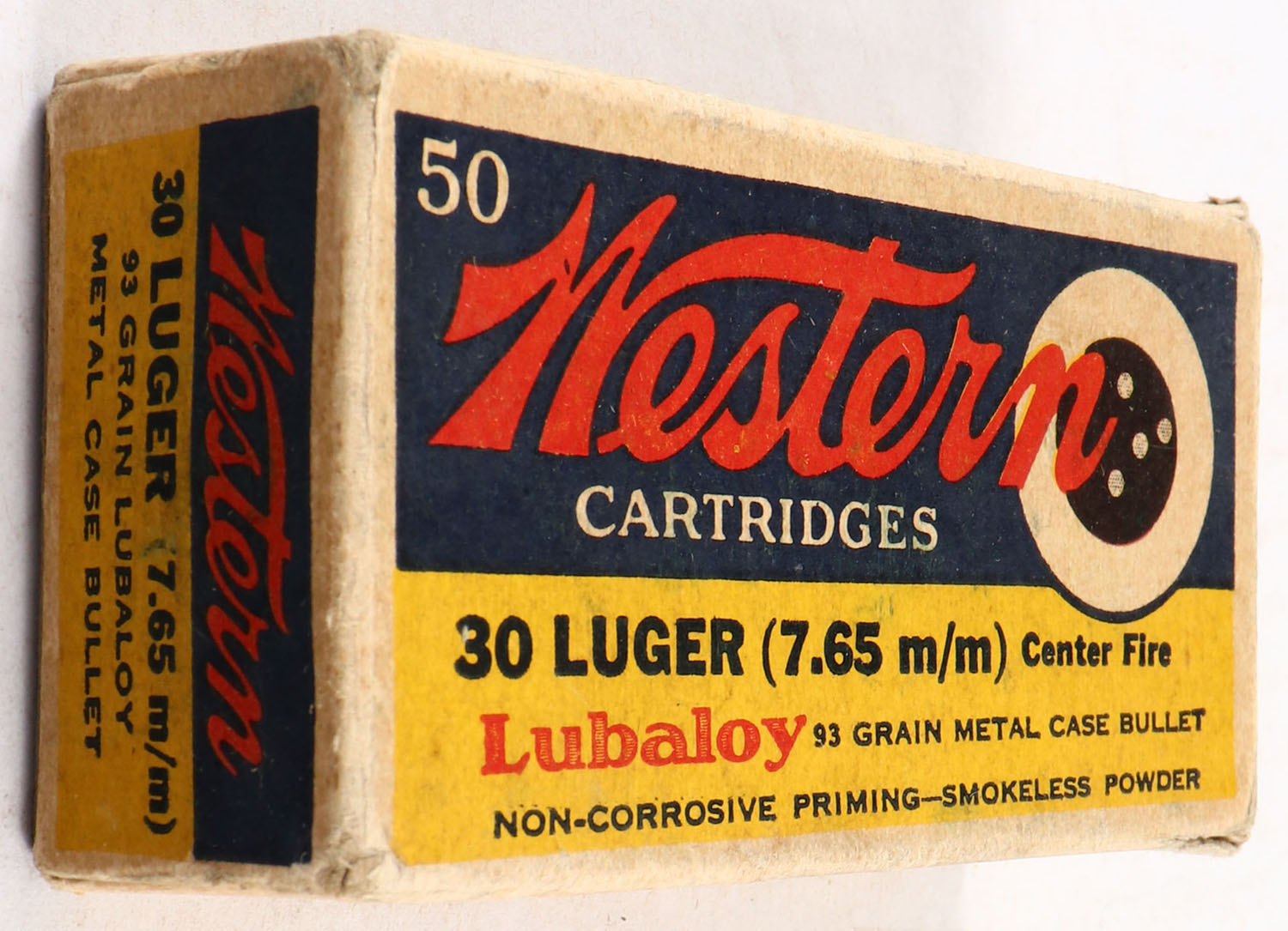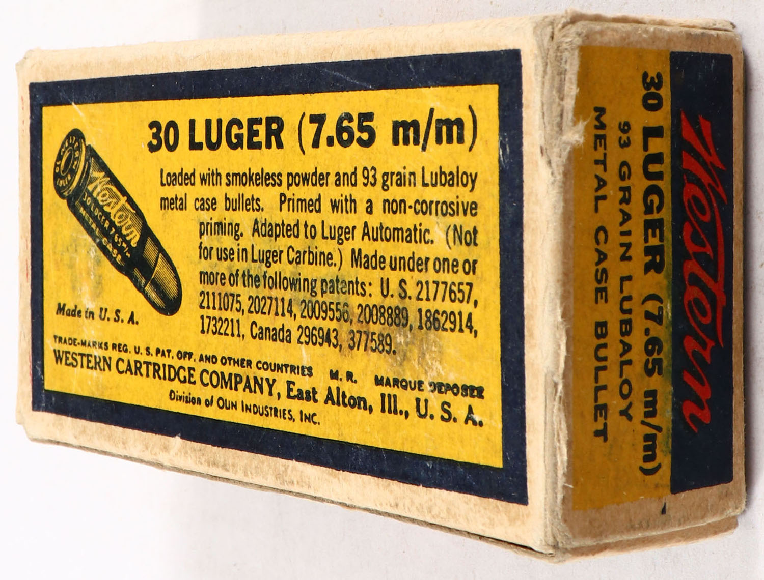 Western, .30 Luger (7.65mm) 93 Grain Metal Case Bullet, Full of mixed H/S, 1pc. Blue yellow & red bulls eye box, box is solid with very good color, some age soiling, some corner wear, minor edge wear, partial seam split to right end flap, left end flap is solid, ammo is good. Grade: Very Good + - Value: 10 to 40
