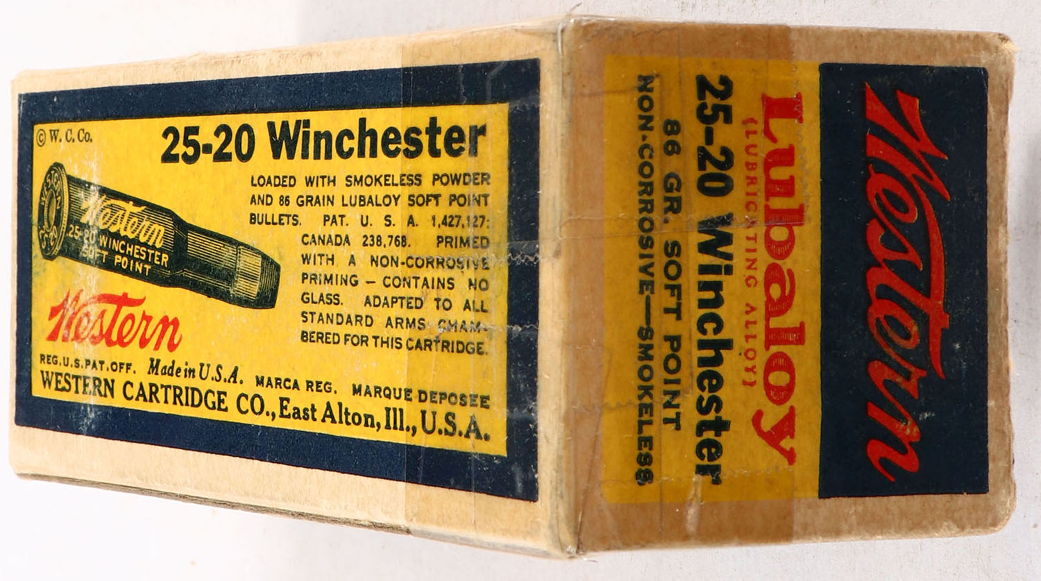 Western, Bullseye box, .25-20 Winchester, 86 Gr. Soft Point, Lubaloy, Full with insert, 1pc. Yellow blue & red bulls eye box, box is solid with very good to excellent color, insert tab of right end flap is missing, box has tape on all sides, minor edge & corner wear, left end flap is solid, insert is good, ammo is excellent. Grade: Very Good - Value: 40 to 120