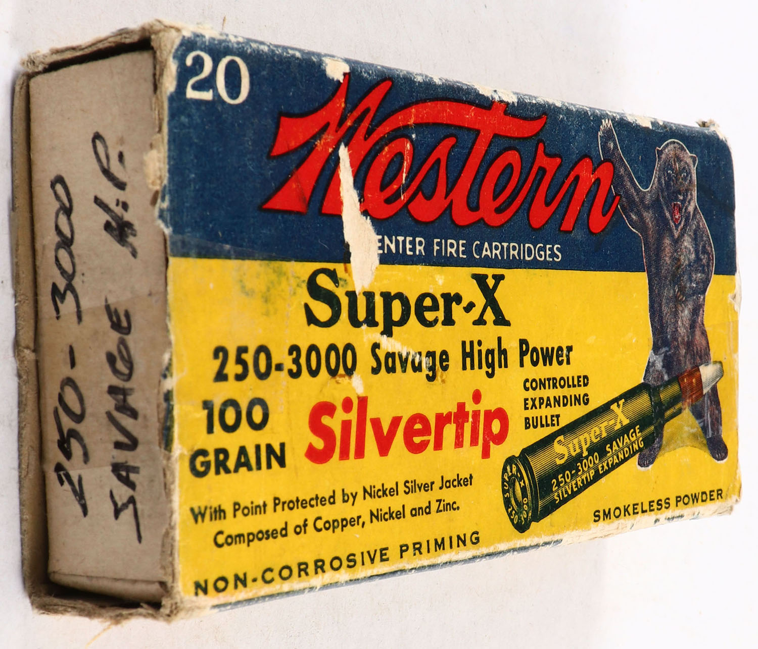 Western, Silvertip, 250-3000 Savage H.P., 100 Grain Controlled Expanding Bullet, Full of incorrect ammo, box is missing both end flaps very good to excellent color, minor age soiling, shelf wear, edge & corner wear, ammo is excellent. Grade: Fair ++ - Value: 8 to 40