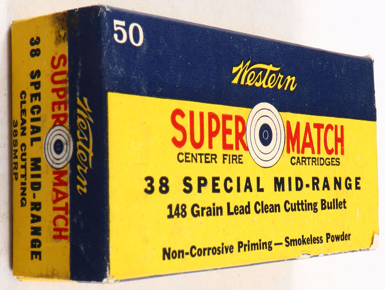 Western, Super Match, .38 Special Mid-Range, 148 Grain Lead Clean Cutting Bullet, Full, 1pc. Yellow blue & red box, box is solid with excellent color, has very minor edge & corner wear, end flaps are solid, ammo is excellent. Grade: Excellent + - Value: 16 to 60