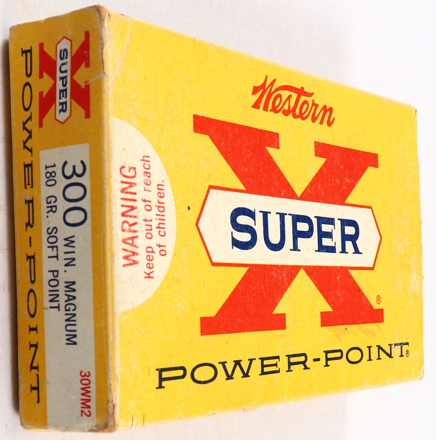 Western, Super X Power-Point, .300 Win. Magnum, 180 Gr. Soft Point, Full, 1pc. Yellow red & white box, box is solid with excellent color, has shelf wear, very minor corner wear, edges are mostly crisp, end flaps are solid, ammo is excellent. Grade: Excellent - Value: 20 to 60