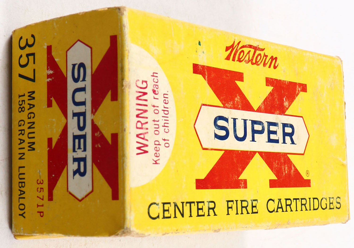 Western, Super-X, .357 Magnum, 158 Grain Lubaloy, Nickel Plated Case, Full, 1pc. Yellow white & red box, box is solid with very good color, minor age soiling, some shelf & corner wear, minor edge wear, end flaps are solid, ammo is excellent to minty. Grade: Very Good + - Value: 16 to 60
