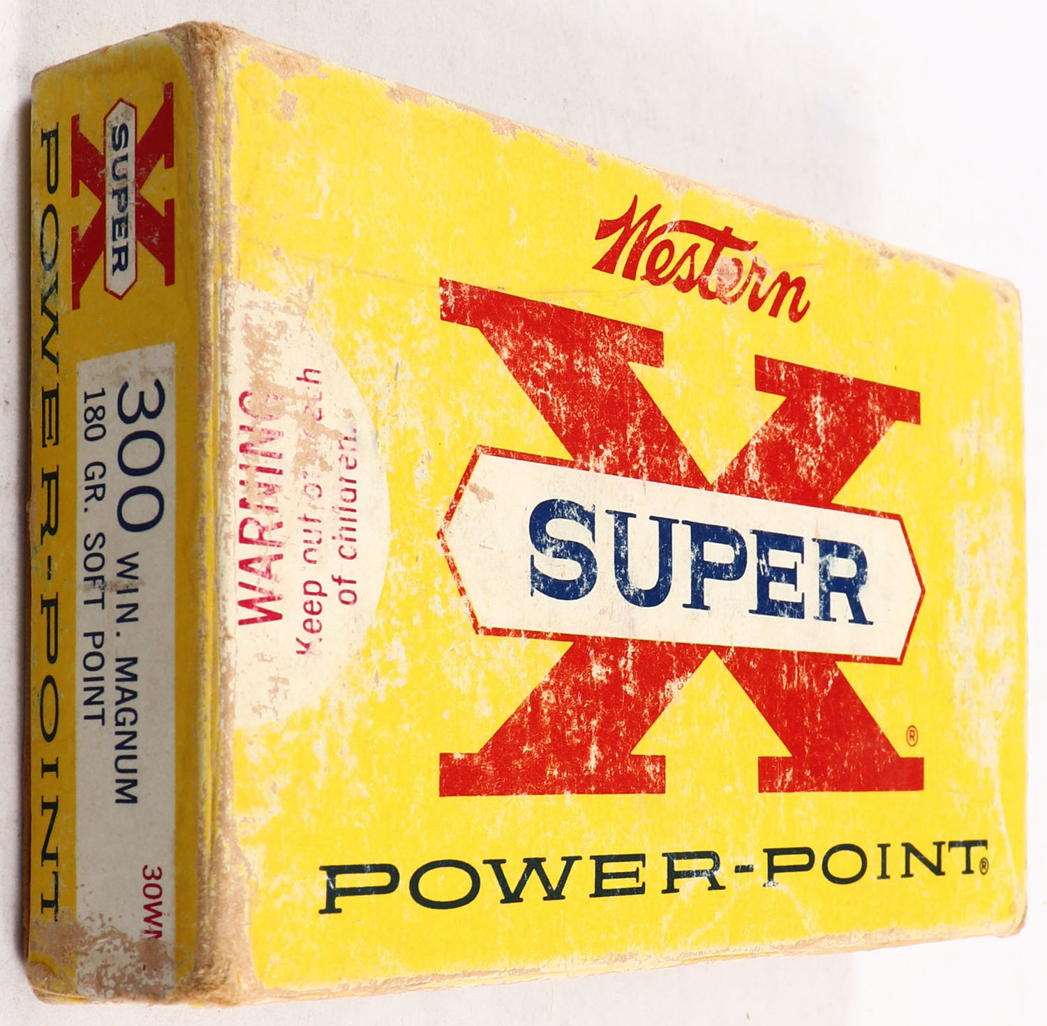 Western, Super-X Power-Point, .300 Winchester Magnum, 180 Gr. Soft Point, Full, 1pc. Yellow red & white box, box is solid with good color, has shelf wear & corner wear, some edge wear, end flaps are solid, ammo is good. Grade: Good ++ - Value: 20 to 60