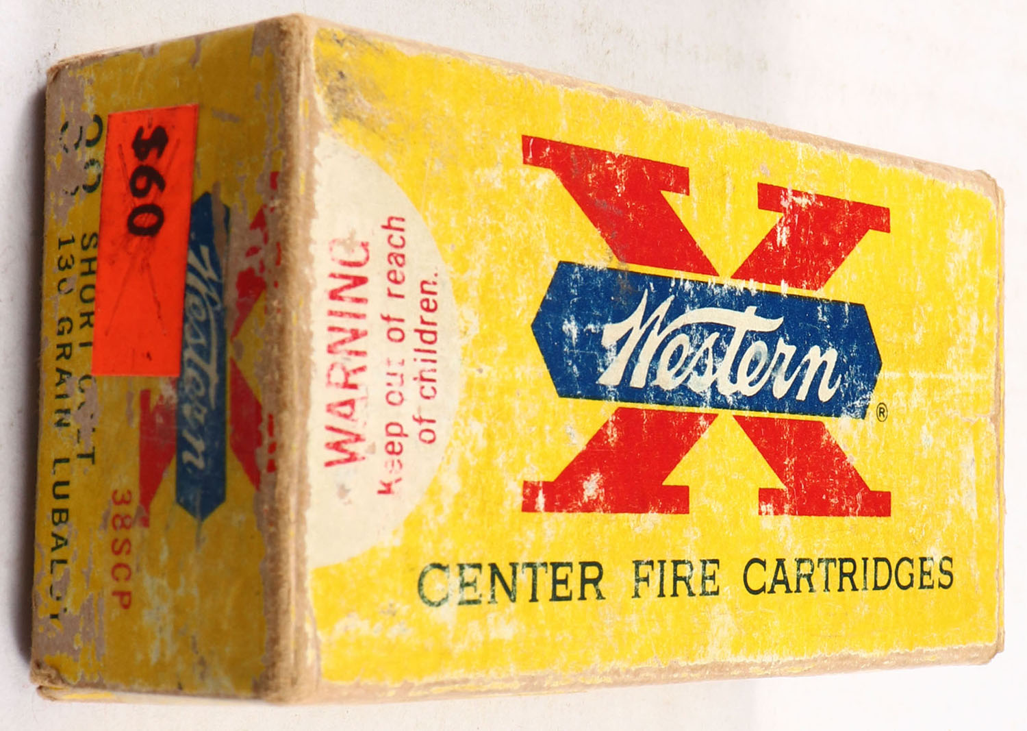 Western, X, .38 Short Colt, 130 Grain Lubaloy, Full of mixed H/S, 1pc. Yellow red & white box, box is solid with good color, shelf wear, some edge & corner wear, end flaps are solid, ammo is excellent. Grade: Very Good - Value: 20 to 60