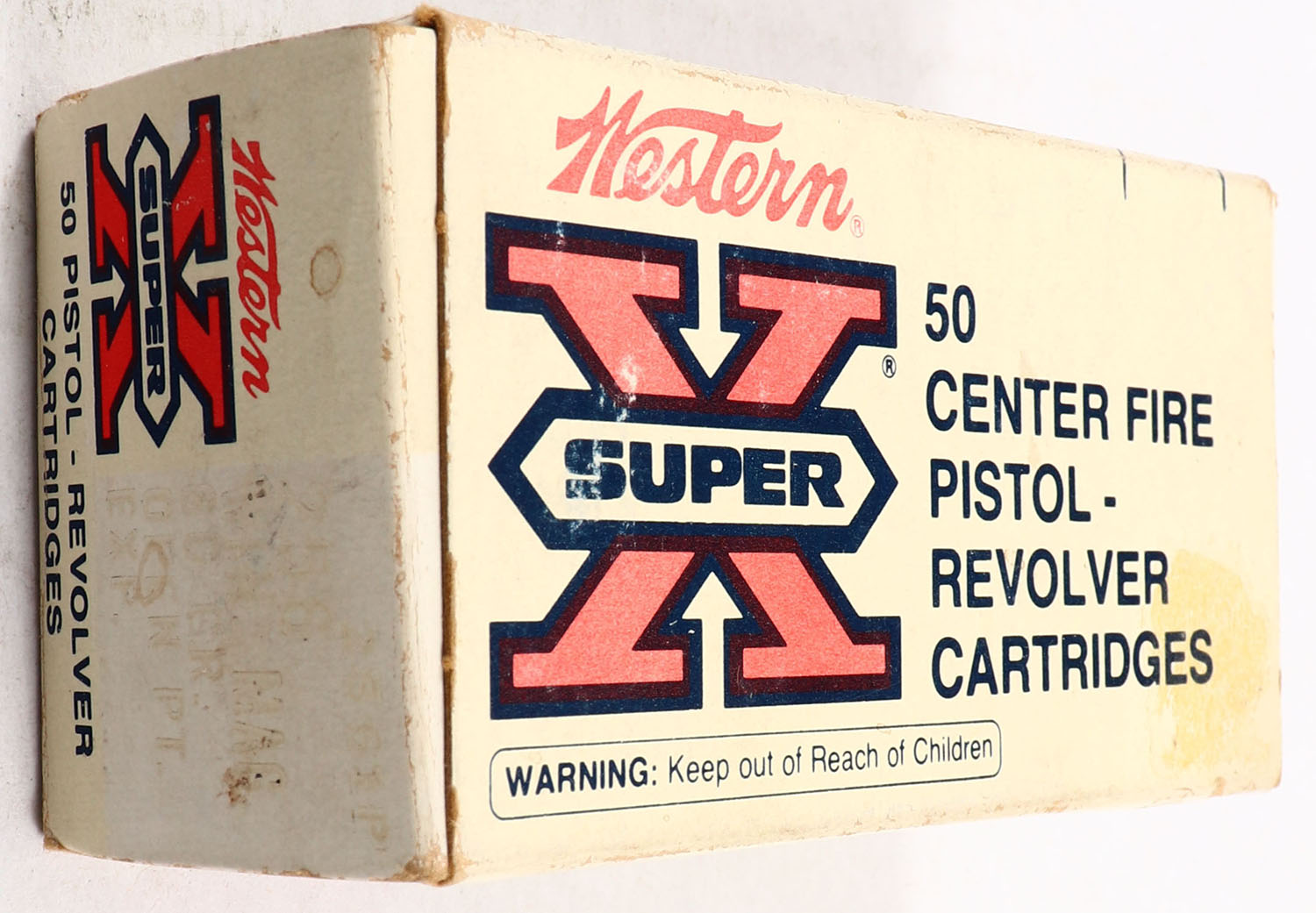 Western, Super-X, .256 Winchester Magnum, 180 Grain Power-Point, Full, 1pc. White red & black box, box is solid with very good color, minor age soiling, some shelf wear, minor edge & corner wear, end flaps are solid, ammo is excellent. Grade: Very Good ++ - Value: 20 to 60
