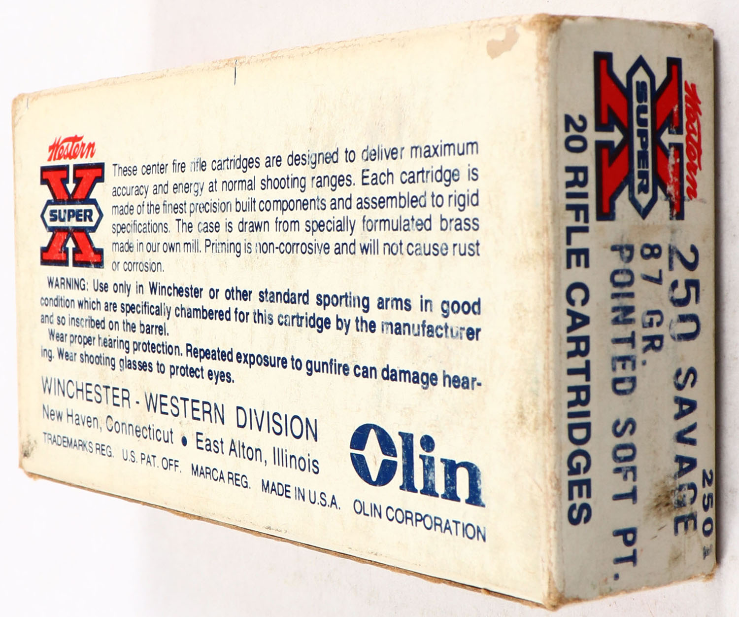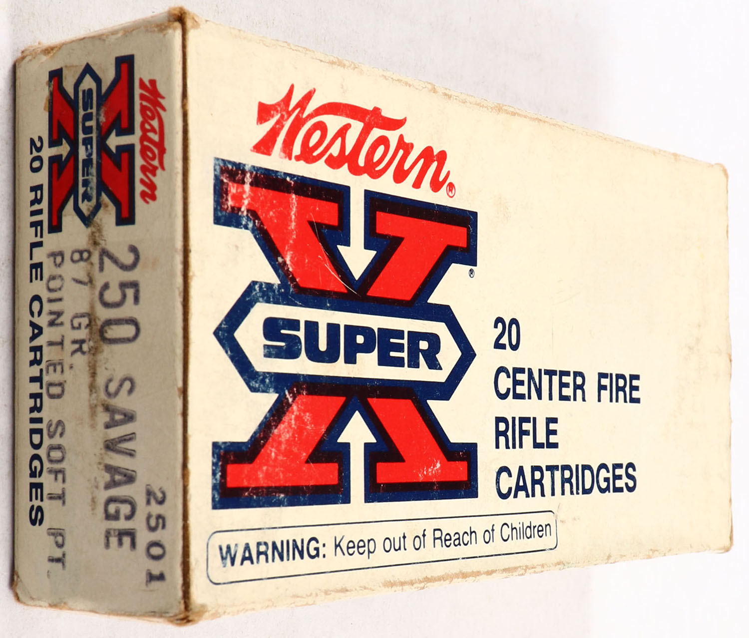 Western, Super-X, 250 Savage, 87 Gr. Pointed Soft, Full, 1pc. White red & black box, box is solid with good color, minor age soiling & shelf wear, has corner wear, edges are crisp, end flaps are solid, ammo is excellent. Grade: Very Good ++ - Value: 20 to 60