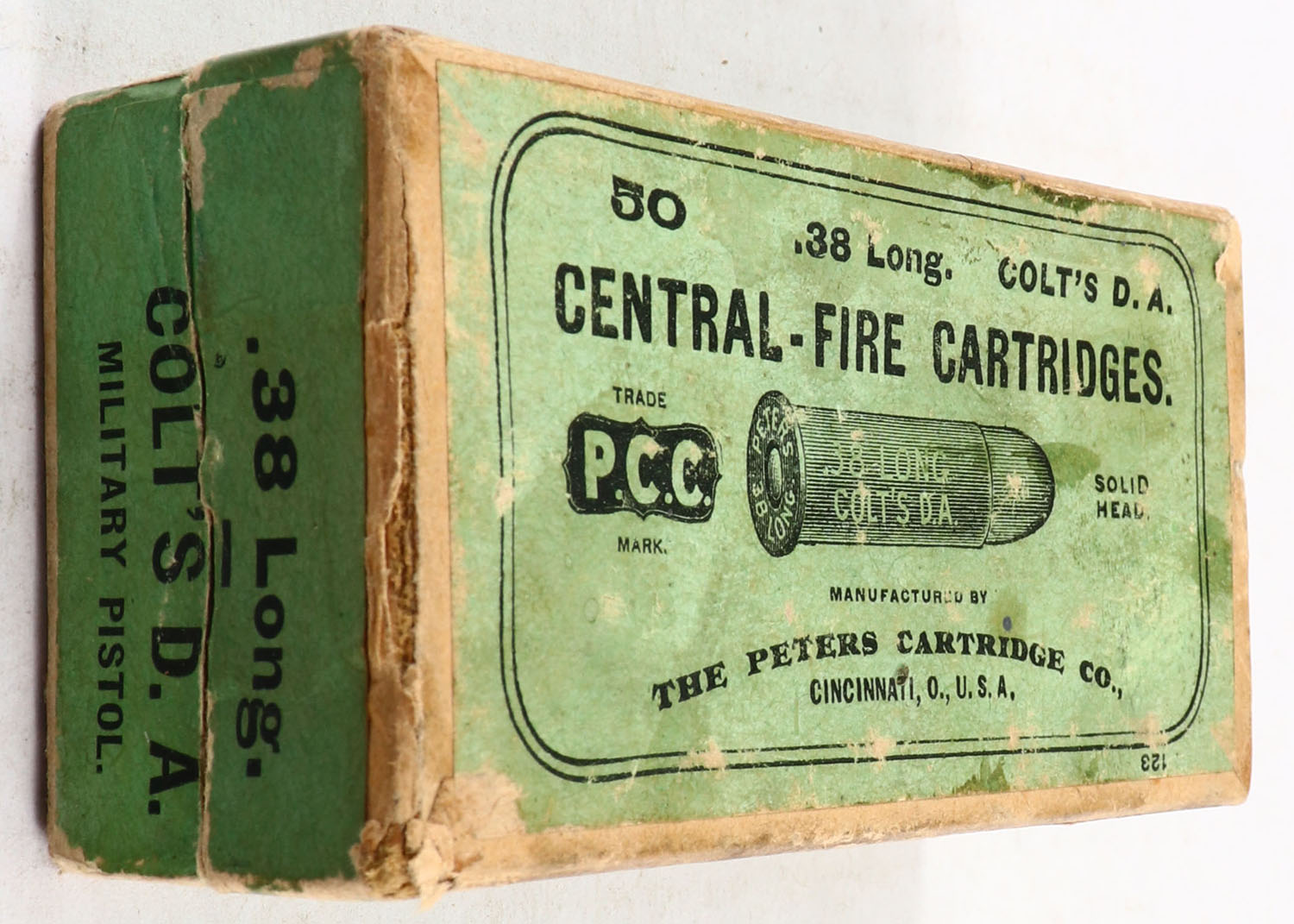 Peters, Central-Fire Cartridges, .38 Long Colt, Solid Head, FULL & SEALED, 2pc. Buff box with green top & side sealing labels, box is solid with very good to excellent color, minor staining & color fading, some edge & corner wear, labels are intact. Grade: Very Good + - Value: 80 to 240