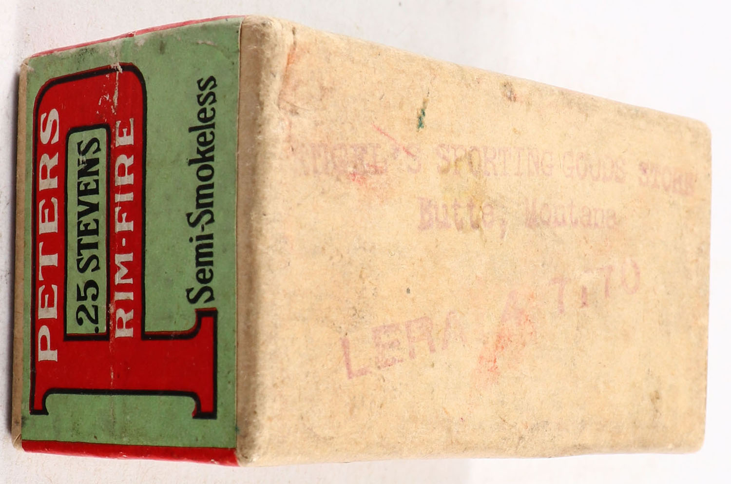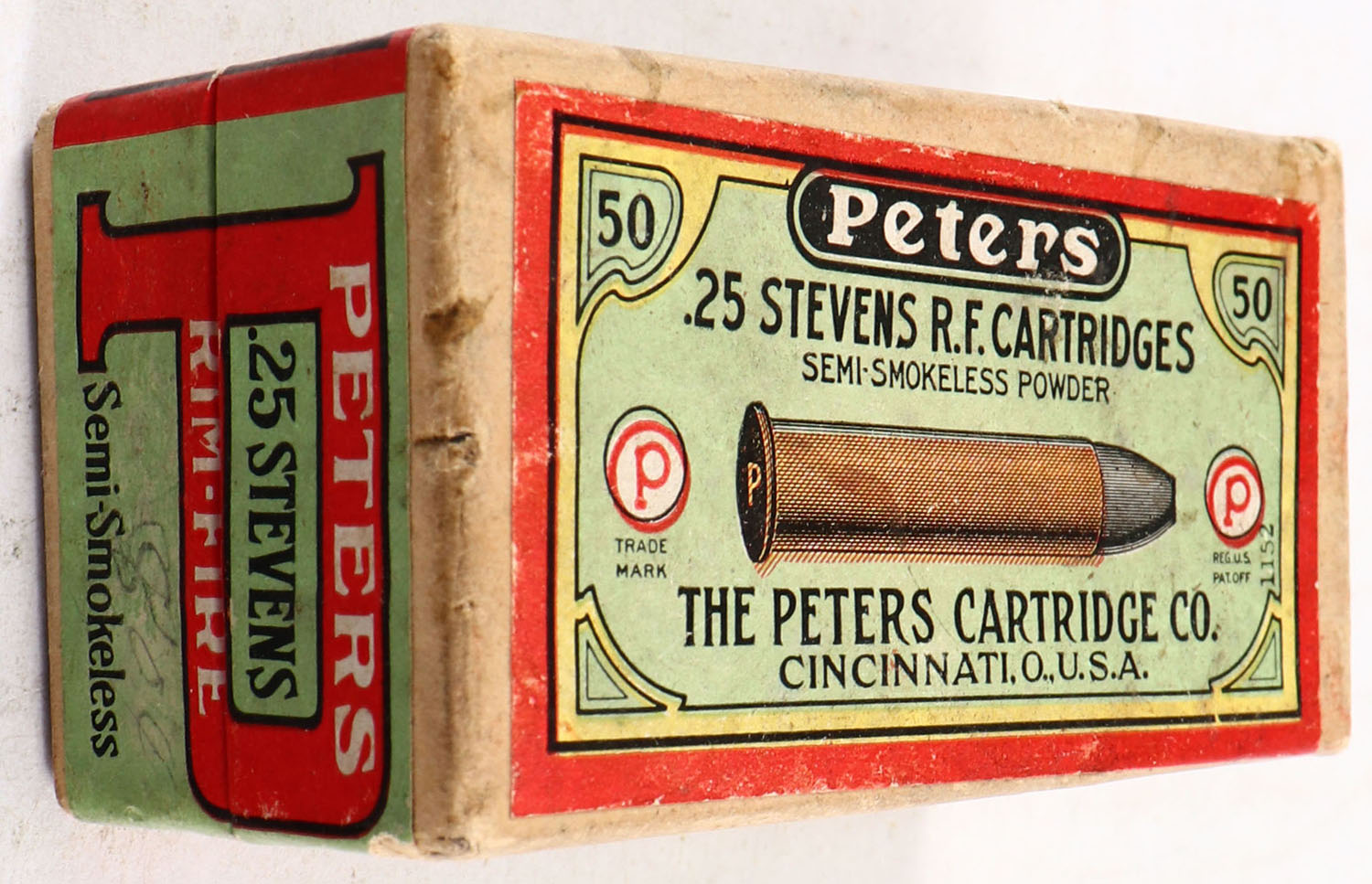 Peters, R.F. Cartridges, .25 Stevens Rim Fire, Semi-Smokeless, FULL & SEALED, 2pc. Buff box with green red & yellow labels, box is solid with very good to excellent color, minor age soiling & color fading, very minor corner wear, edges are crisp, labels are intact. Grade: Excellent - Value: 100 to 300