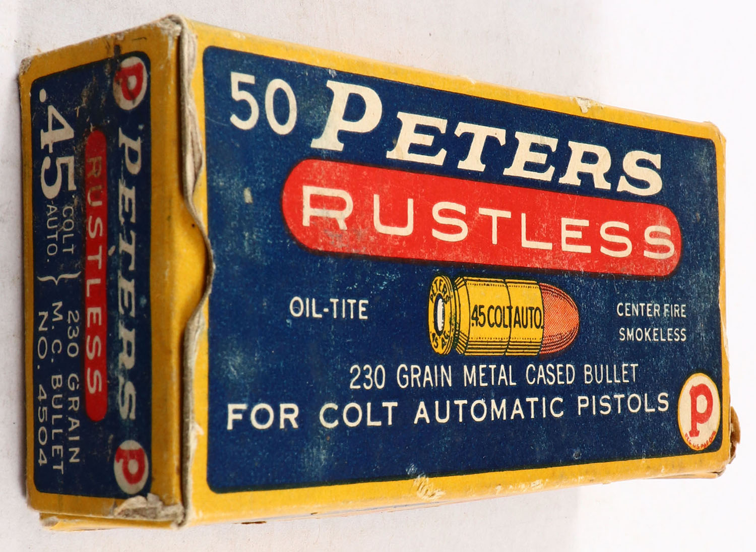 Peters, Rustless, .45 Colt Auto. (.45 Auto.), 230 Grain M.C. Bullet, Full, 1pc. Blue yellow & red box, box is solid with very good to excellent color, minor age soiling & shelf wear, factory seam loosened, some very minor corner wear, end flaps are solid, ammo is excellent. Grade: Very Good ++ - Value: 40 to 80