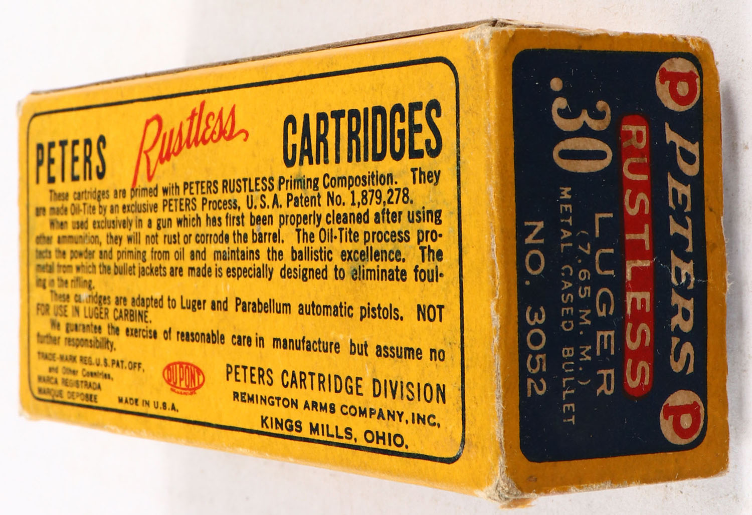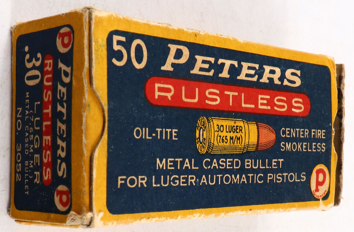 Peters, Rustless, .30 Luger (7.65mm), Metal Cased Bullet, Full, 1pc. Blue yellow & red box, box is solid with very good color, some age soiling & shelf wear, insert tab of right end flap is solid, some edge & corner wear, left end flap is solid, ammo is excellent. Grade: Very Good + - Value: 16 to 60