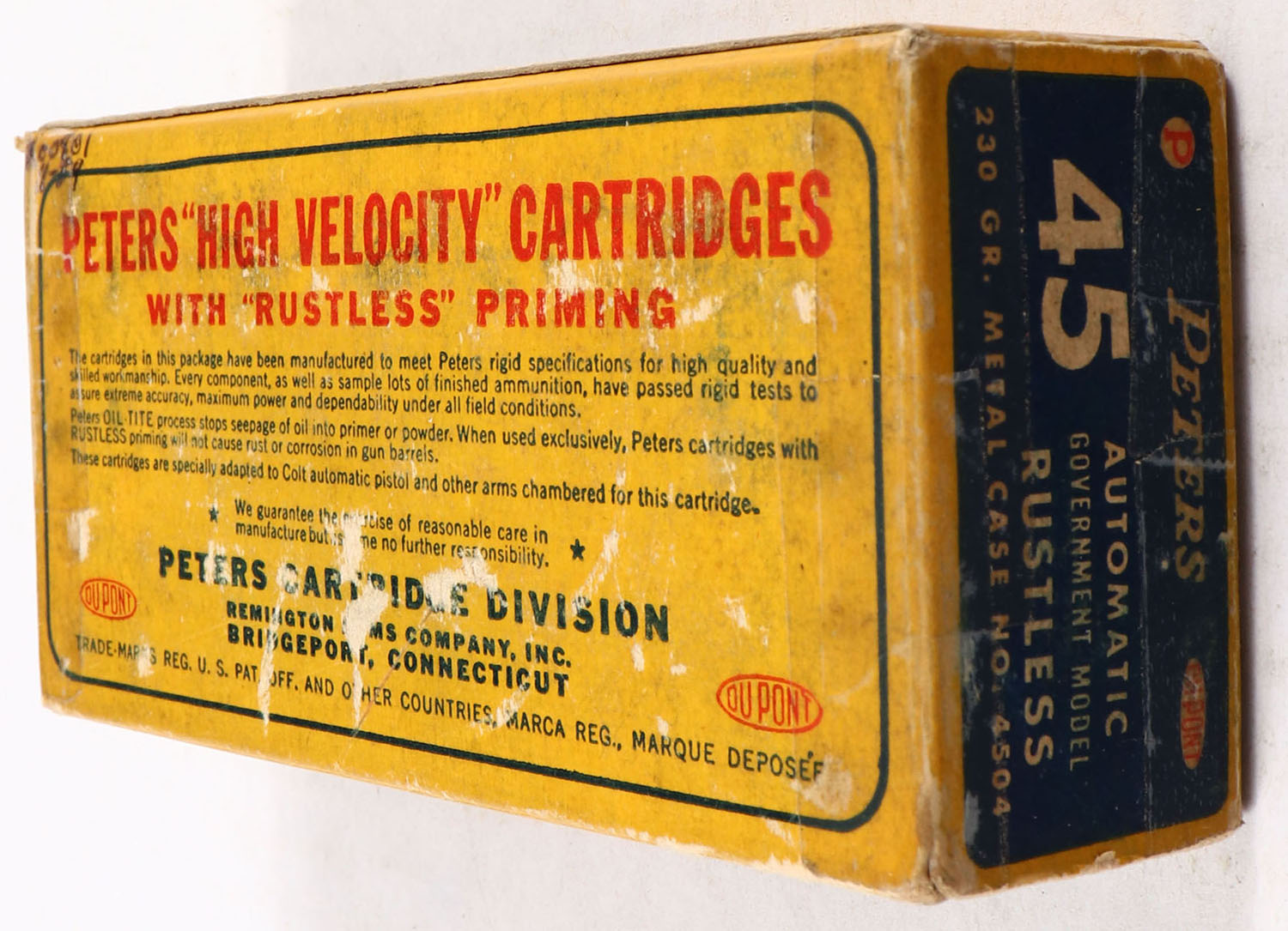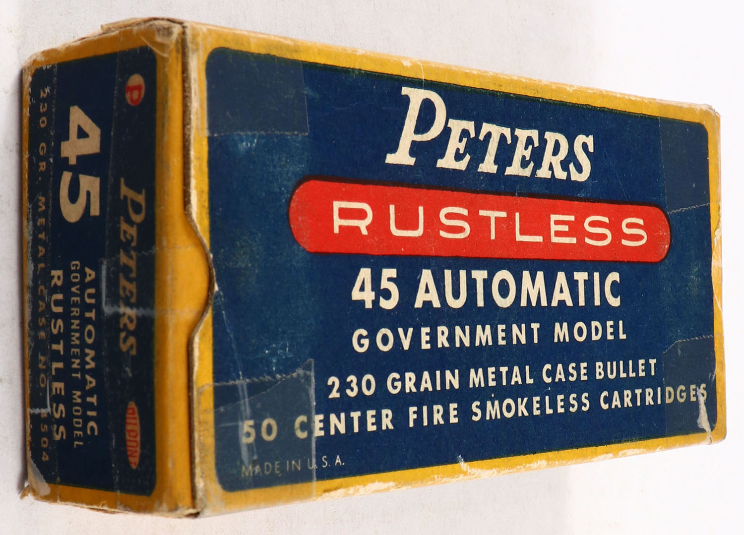 Peters, Rustless, .45 Automatic, 239 Grain Metal Case Bullet, Full, 1pc. Blue yellow & red box, box is solid with very good to excellent color, minor age soiling & shelf wear, tape on all corners, some edge & corner wear, end flaps are solid, ammo is excellent. Grade: Very Good ++ - Value: 20 to 60