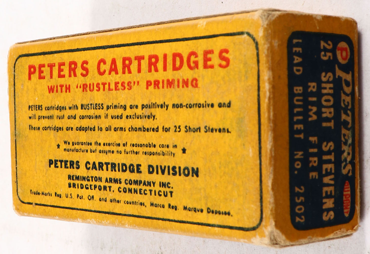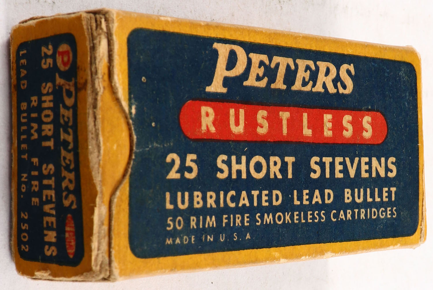 Peters, Rustless, .25 Short Stevens Rim Fire, Lead Bullet, Full, 1pc. Blue yellow & red box, box is solid with very good color, minor age soiling, very minor edge & corner wear, end flaps are solid, ammo is excellent. Grade: Excellent - Value: 30 to 90