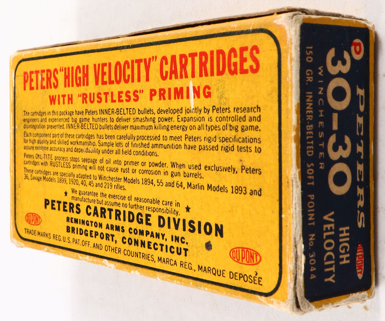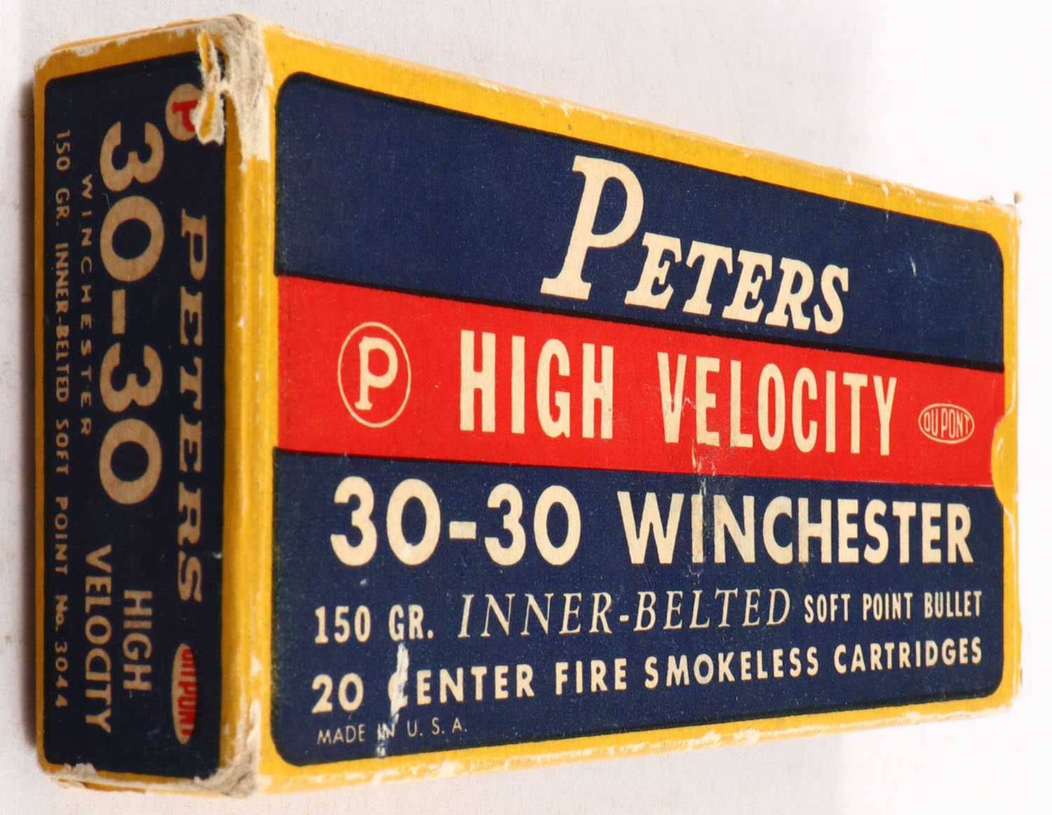 Peters, High Velocity, .30-30 Winchester, 150 Gr. Inner-Belted Soft Point Bullet, smokeless, 1pc, Full, yellow box with blue/red label & white print, box is solid with excellent color, minor edge & corner wear, end flaps are solid, ammo is very good to excellent. Grade: Excellent - Value: 20 to 60