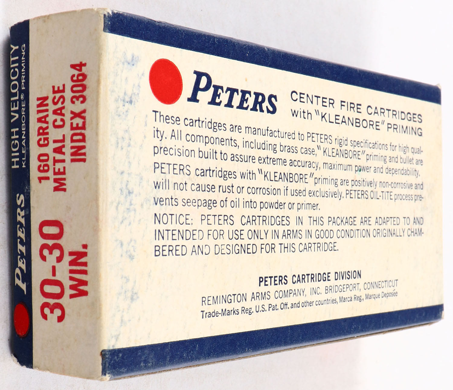 Peters, High Velocity, .30-30 Winchester, 160 Grain Metal Case, Full, 1pc. Blue white & red box, box is solid with excellent color, minor shelf wear, edges are mostly crisp, end flaps are solid, ammo is excellent. Grade: Excellent - Value: 20 to 60