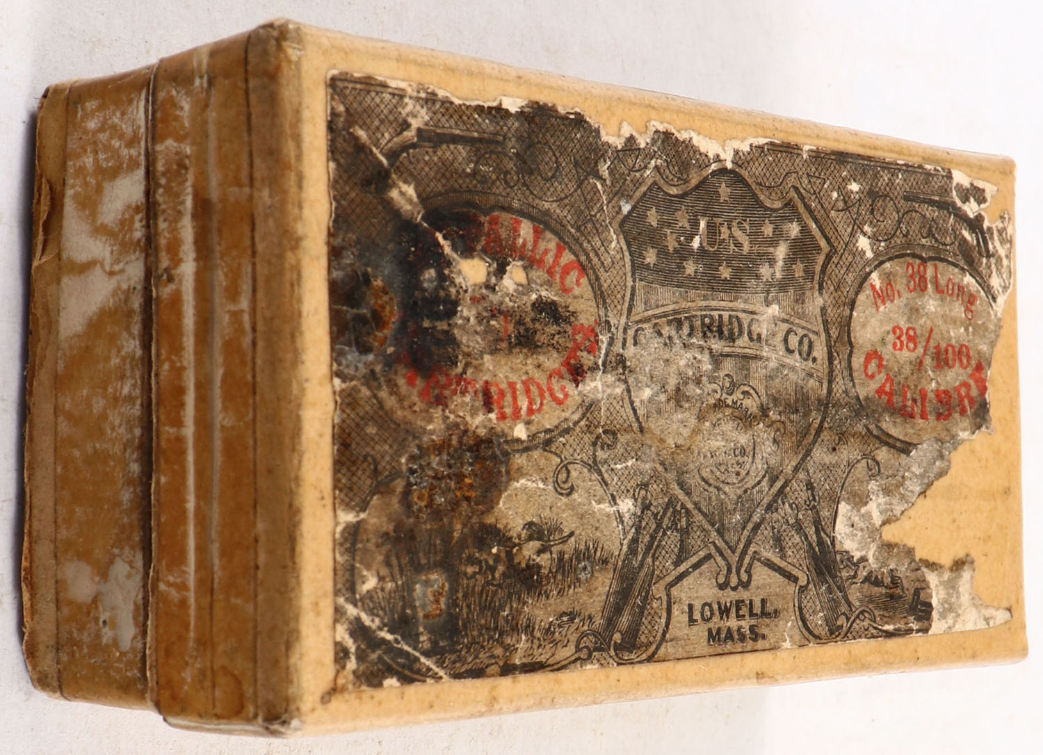 U.S., Metallic Cartridges, .38 Long Rim Fire, Full, 2pc. Buff box with gray top label, side sealing labels are gone, box is solid with poor color, age soiling & shelf wear, very minor corner wear, edges are mostly crisp, top label is 90% intact, ammo is very good. Grade: Good - Value: 40 to 120