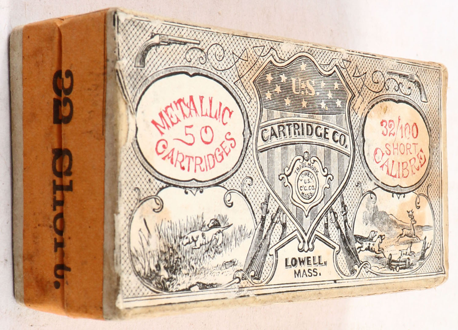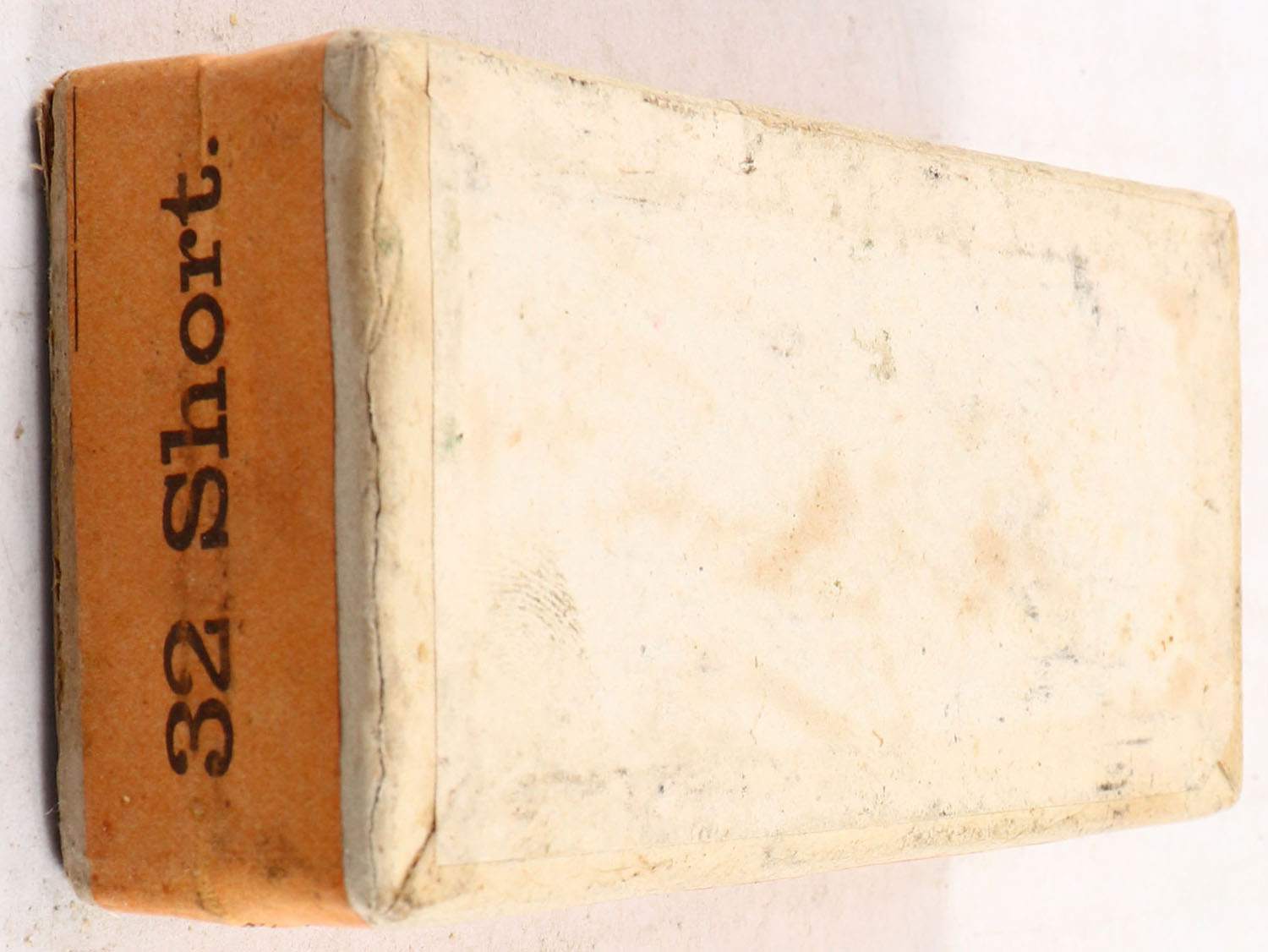 U.S., Metallic Cartridges, .32 Short, FULL & SEALED, 2pc. Buff box with gray top & orange side sealing labels, box is solid with excellent color, minor staining on top, seam split to top right edge, partial seam split to top front edge, very minor corner wear, edges are mostly crisp, labels are intact. Grade: Excellent - Value: 80 to 240