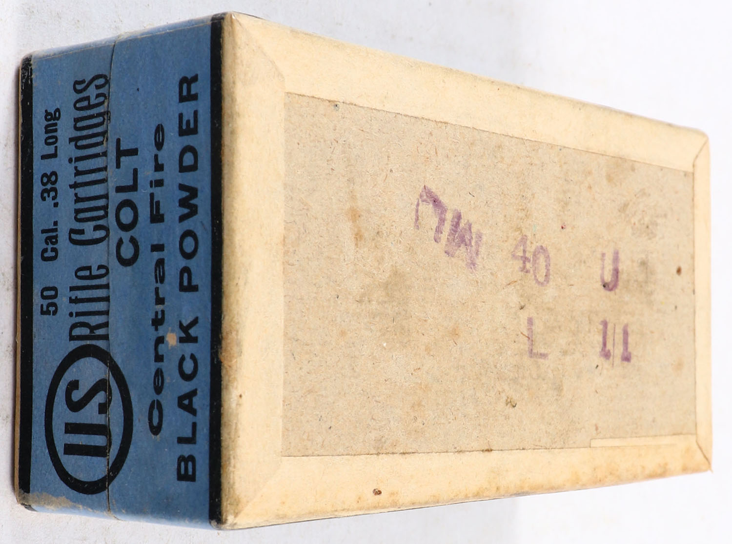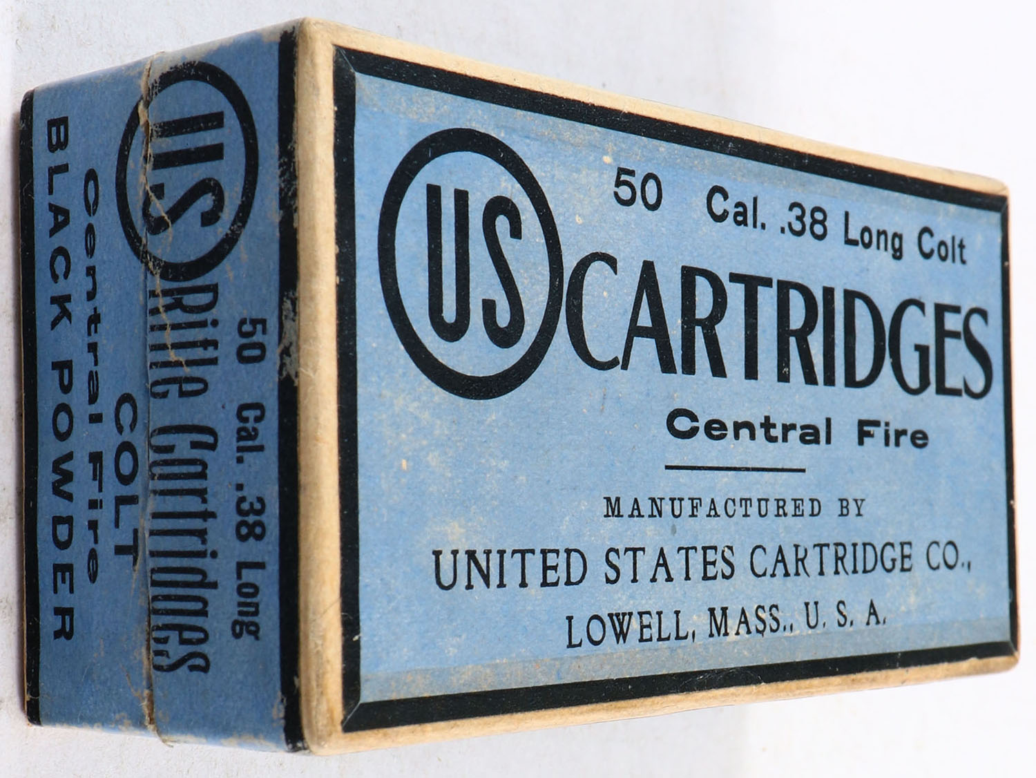 U.S., Central Fire Cartridges, .38 Long Colt, Black Powder, FULL & SEALED, 2pc. Buff box with blue top & side sealing labels, box is solid with excellent color, very minor shelf & corner wear, edges are mostly crisp, labels are intact. Grade: Excellent + - Value: 300 to 1200