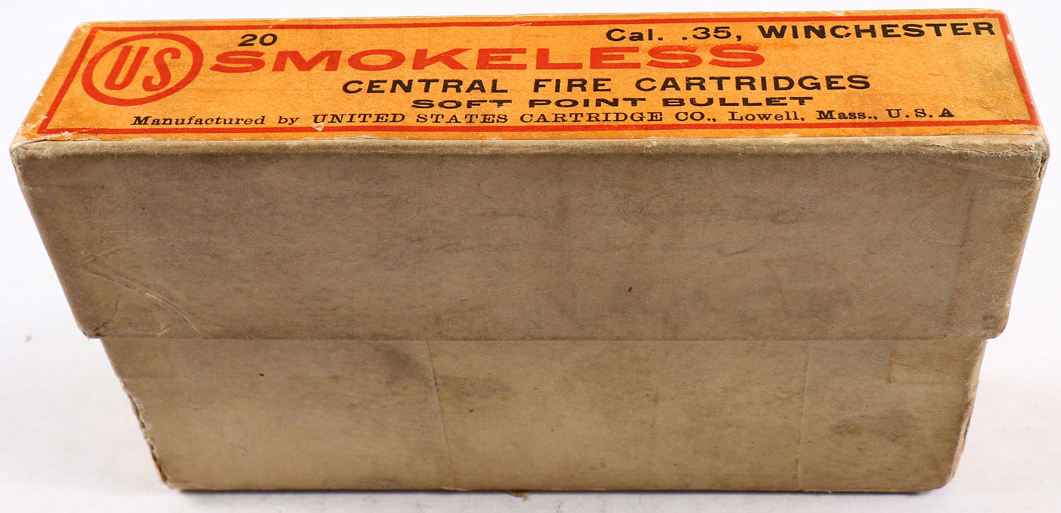 U.S., Smokeless Central Fire Cartridges, .35 Winchester, Soft Point Bullets, Full, 2pc. Buff box with orange & red label, box is solid with excellent color, minor age soiling & corner wear, edges are mostly crisp, labels are intact, ammo is excellent. Grade: Excellent - Value: 50 to 150