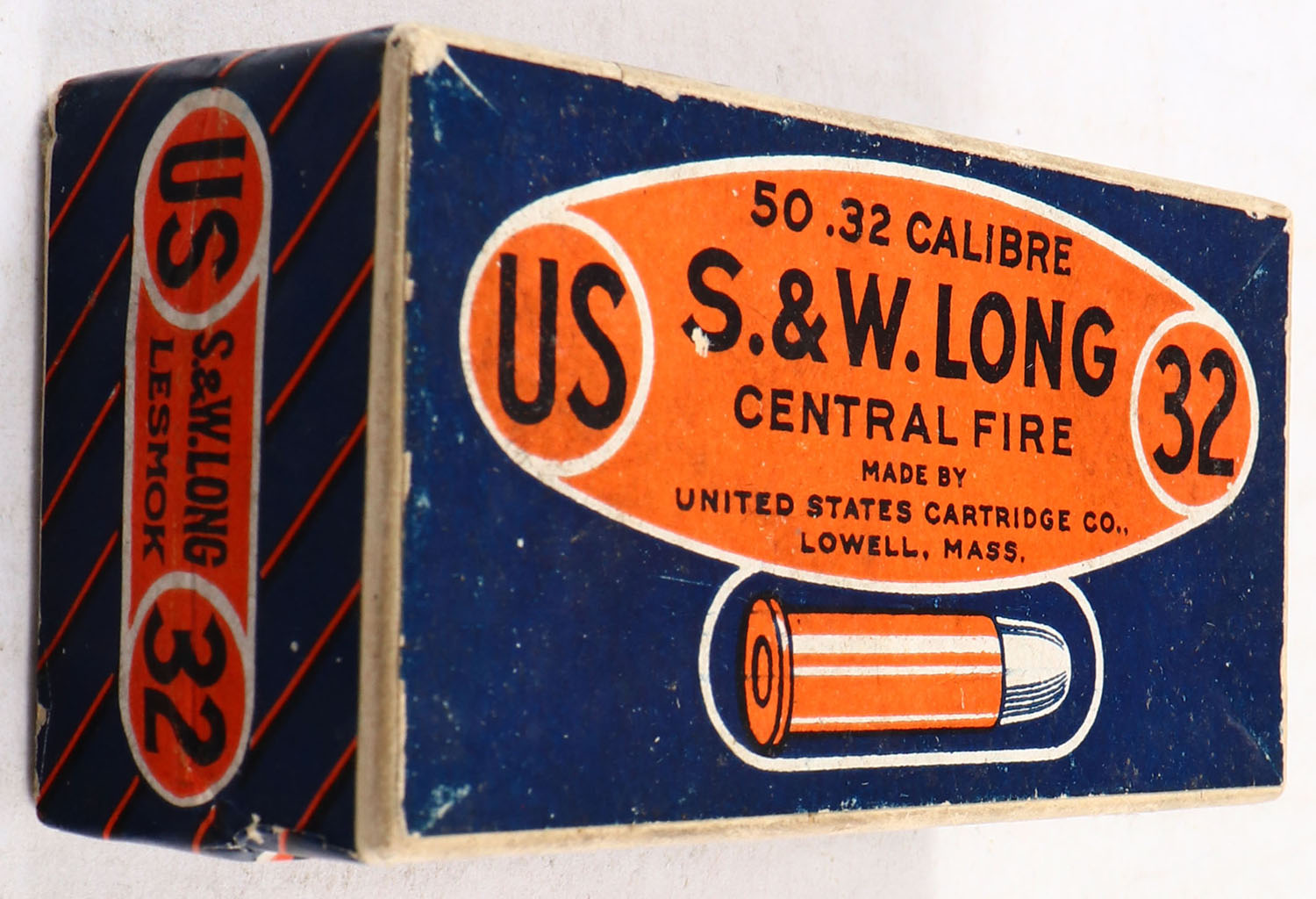 U.S., Lesmok Central Fire, .32 Smith & Wesson Long, FULL & SEALED, 2pc. Buff box with blue & orange labels, box is near mint with minty color, only has very minor shelf wear, corners are sharp, edges are crisp, labels are intact. Grade: Excellent ++ - Value: 30 to 90