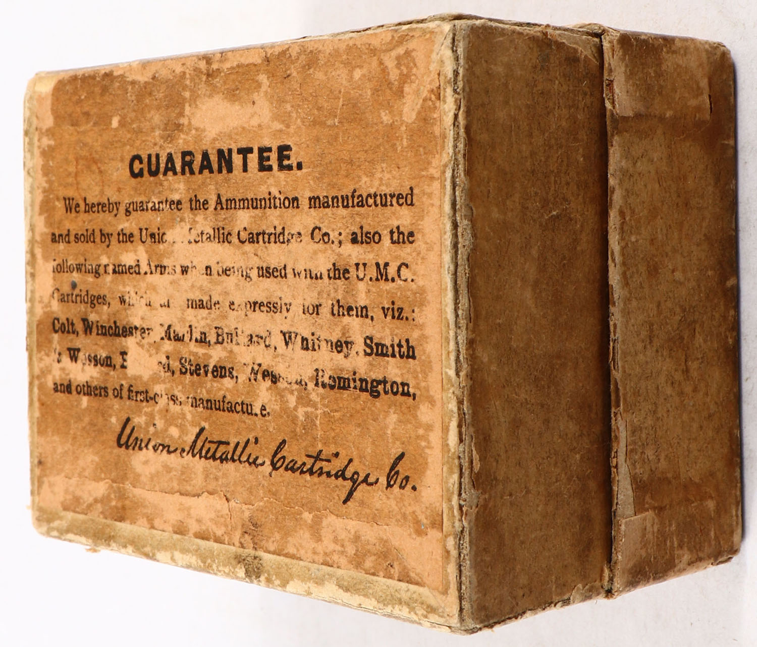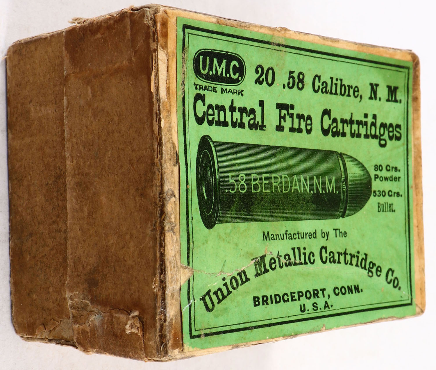 UMC, Central Fire Cartridges, .58 Berdan, 80 Grs. Powder, 530 Grs. Bullet, Partial 4rds., 2pc. Buff box with green top label, box is solid with excellent color, minor age soiling, several tape repairs on corners, some edge & corner wear, top label is solid, ammo is very good. Grade: Very Good + - Value: 40 to 200