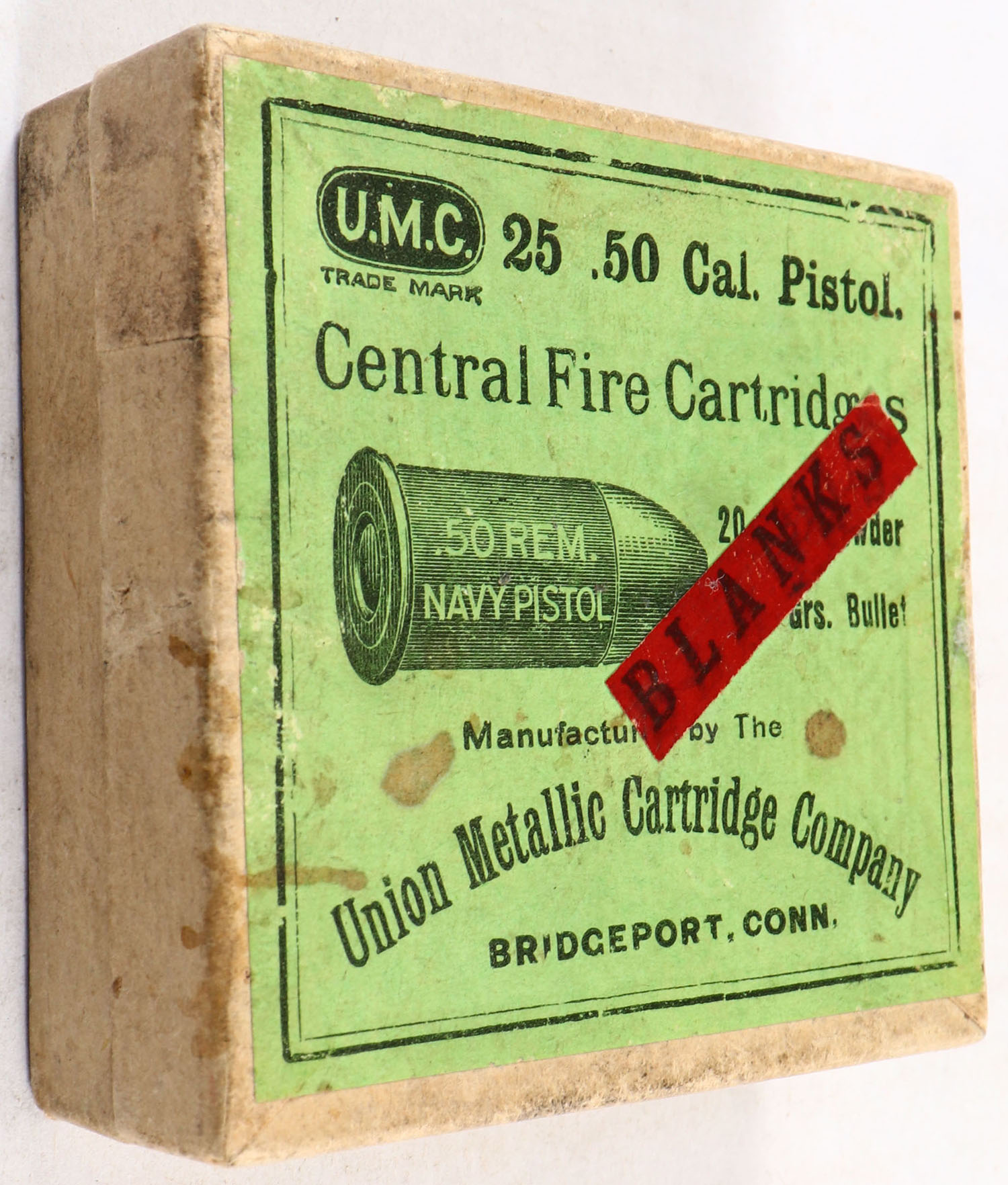 UMC, Central Fire Cartridges, .50 Rem. Navy Pistol Blanks, Full, 2pc. Buff box with green top label & red ''Blanks'' over-label, box is solid with excellent color, very minor age soiling, minor staining on top, corners are mostly sharp, edges are mostly crisp, top label is intact, ammo is very good. Grade: Very Good ++ - Value: 50 to 200