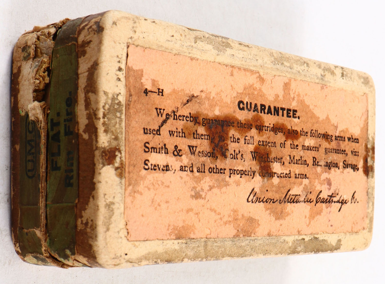 UMC, Rim-Fire Cartridges, .44 Henry Flat, Swaged Bullets, Empty, 2pc. Buff box with green top & side sealing labels, box is solid with good to very good color, age soiling, shelf wear, some edge & corner wear, side sealing label is 80% intact. Grade: Good - Value: 10 to 50