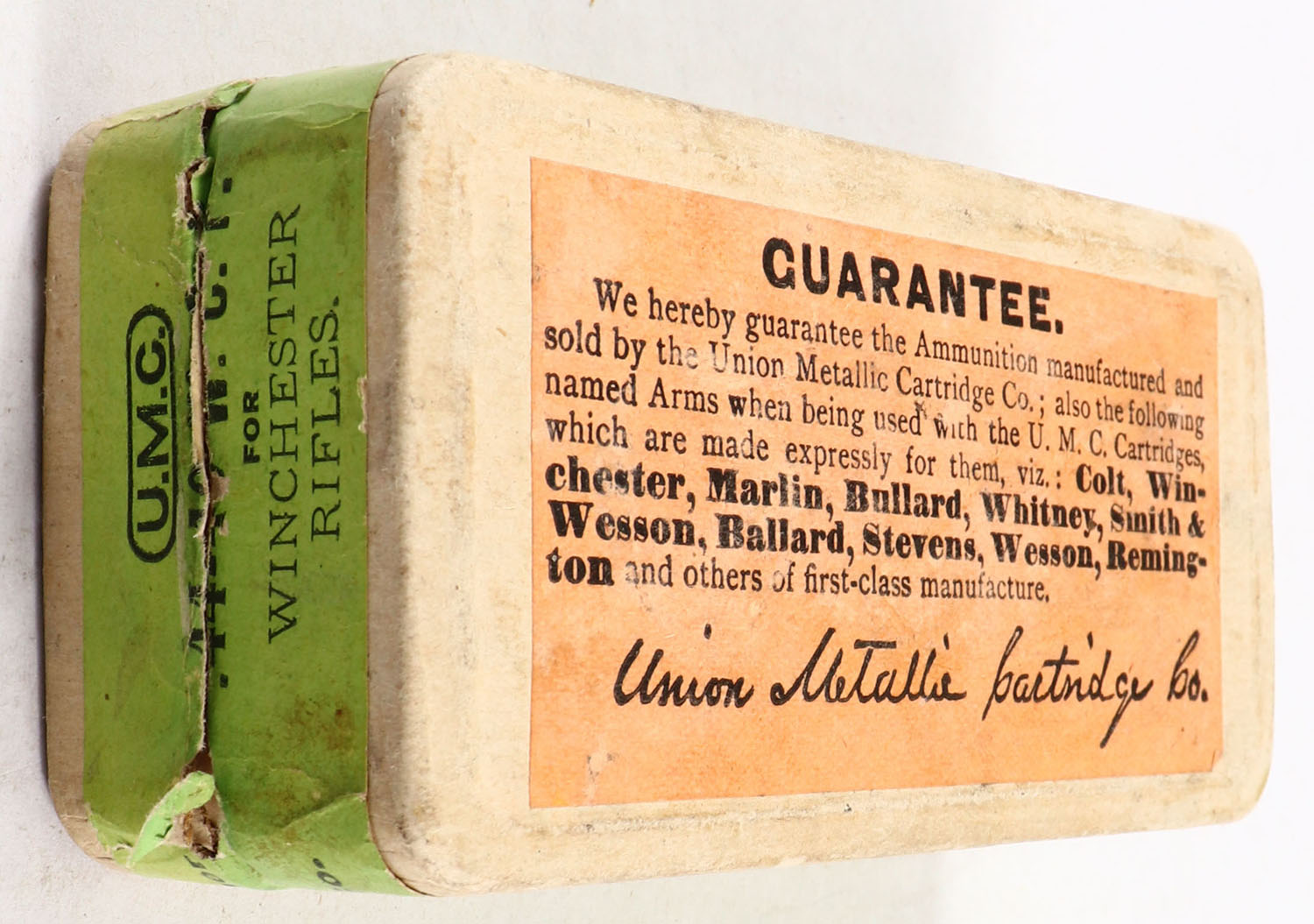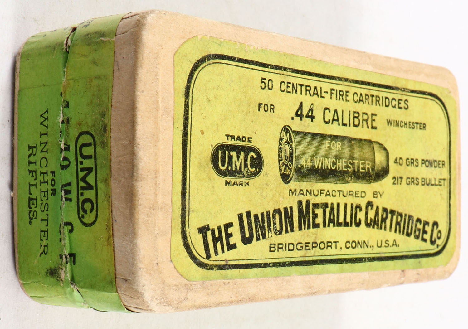 UMC, Central-Fire Cartridges, .44 Winchester (.44-40), 40 Grs. Powder, 217 Grs. Bullet, Full, 2pc. Buff box with green top & side sealing labels, box is solid with excellent color, very minor age soiling & corner wear, edges are crisp, labels are intact, ammo is good. Grade: Excellent - Value: 80 to 240