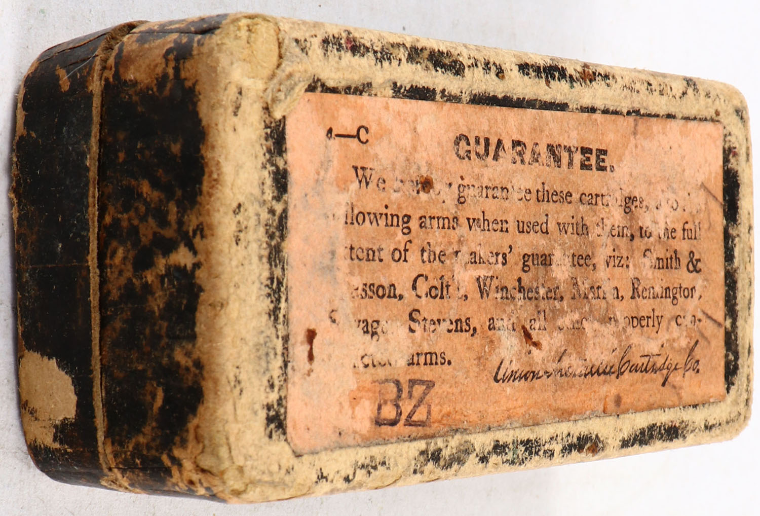 UMC, Central Fire Cartridges, .32 Colt Police Positive, 13 Grs. Powder, 100 Gr. Bullet, Full, 2pc. Black mottled box with red top label, side sealing label is gone, box is solid with very good color, some age soiling, minor shelf wear, some edge & corner wear, top label is intact, ammo is excellent. Grade: Very Good + - Value: 16 to 60