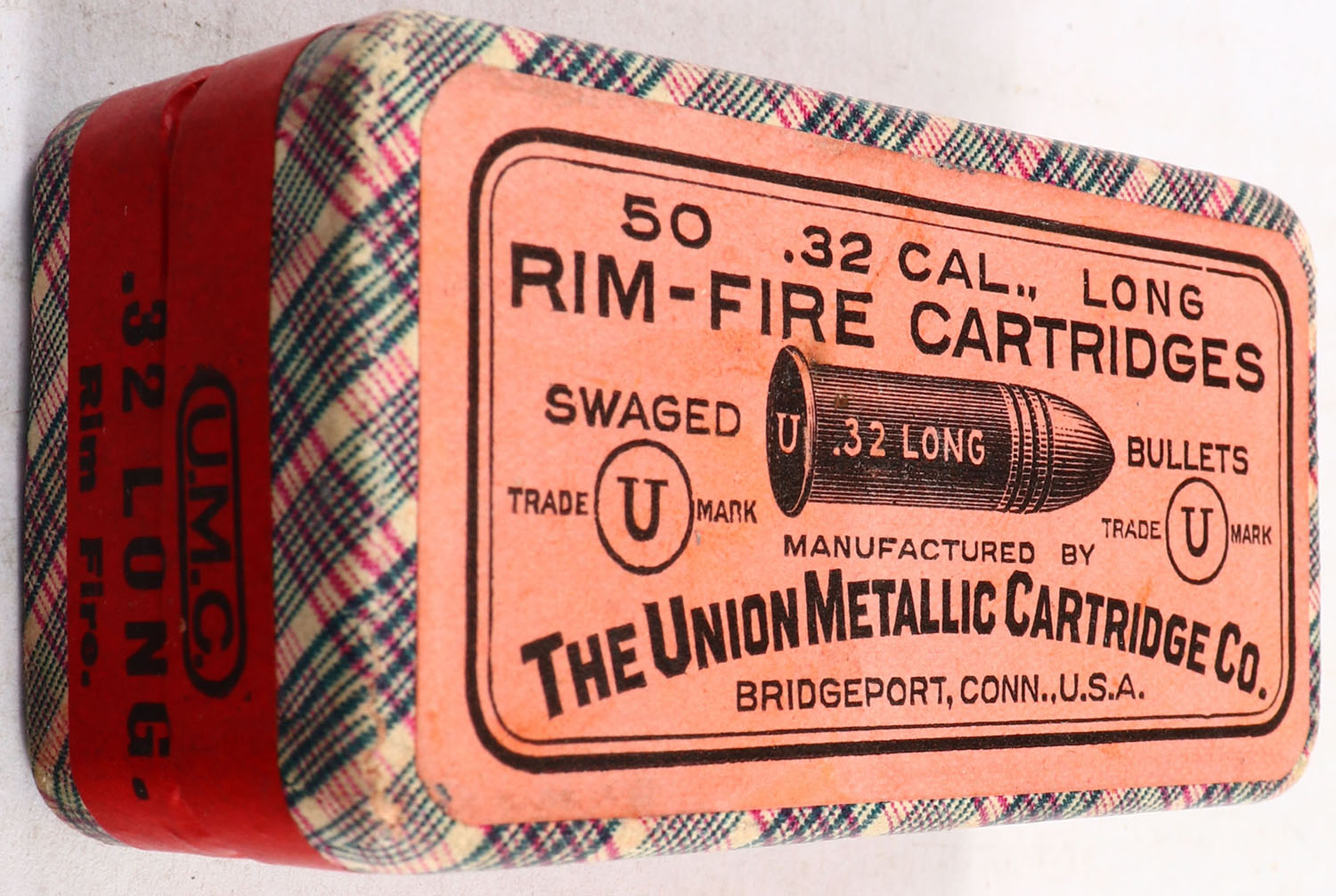 UMC, Rim-Fire Cartridges, .32 Long Rim Fire, Swaged Bullets, FULL & SEALED, 2pc. Purple fabric box with pink top & red side sealing labels, box is near mint with excellent to minty color, very minor age soiling & corner wear, edges are crisp, labels are intact. Grade: Excellent ++ - Value: 40 to 120