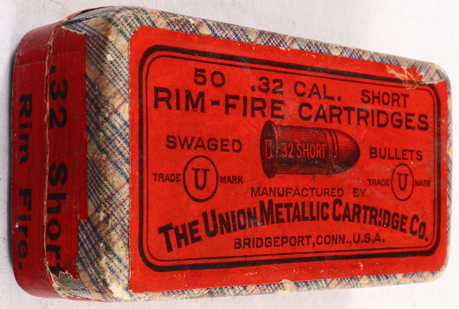 UMC, Rim-Fire Cartridges, .32 Short Rim Fire, Swaged Bullets, Full, 2pc. Purple fabric box, box is solid with excellent color, very minor age soiling, very minor edge & corner wear, labels are intact, ammo is very good. Grade: Excellent - Value: 40 to 120