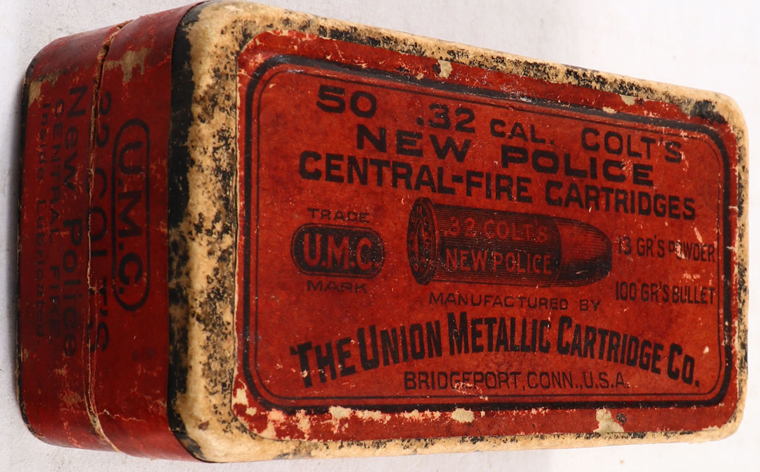 UMC, Central-Fire Cartridges, .32 Colt's New Police, 13 Gr's Powder, 100 Gr's Bullet, Full, 2pc. Black mottled box with red top & side sealing labels, box is solid with very good color, minor age soiling, some shelf wear, some edge & corner wear, labels are intact, ammo is excellent. Grade: Very Good + - Value: 20 to 60