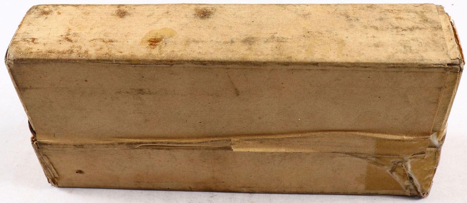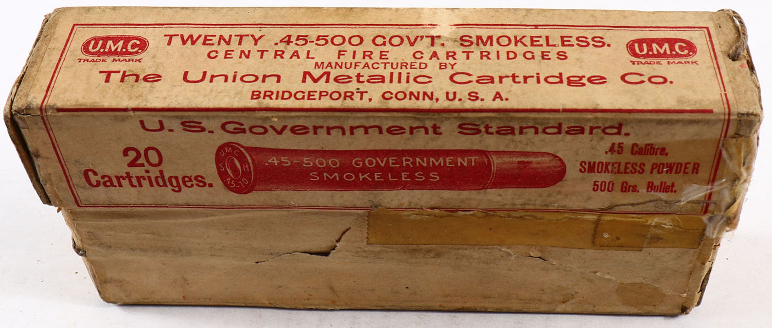 UMC, Central Fire Cartridges, .45-500 Government, Smokeless Powder, 500 Grs. Bullet, Contents Unknown, 2pc. Buff box with buff label, box has been glued shut, tape on right end, very good to excellent color, minor age soiling, some corner wear, edges are mostly crisp, label is intact. Grade: Very Good - Value: 20 to 60