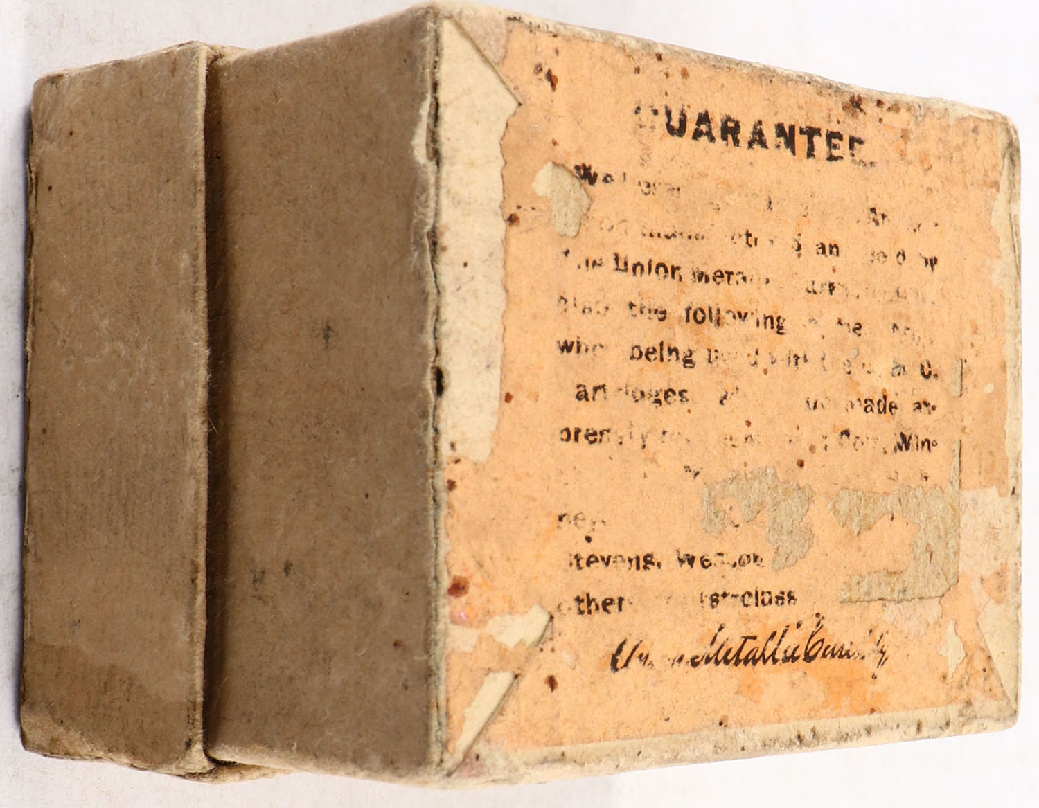 UMC, Blanks, .45 Calibre, 2pc. Buff box with buff top label, box is solid with excellent color, very minor shelf wear, minor edge & corner wear, label is intact, ammo is very good. Grade: Very Good ++ - Value: 10 to 50