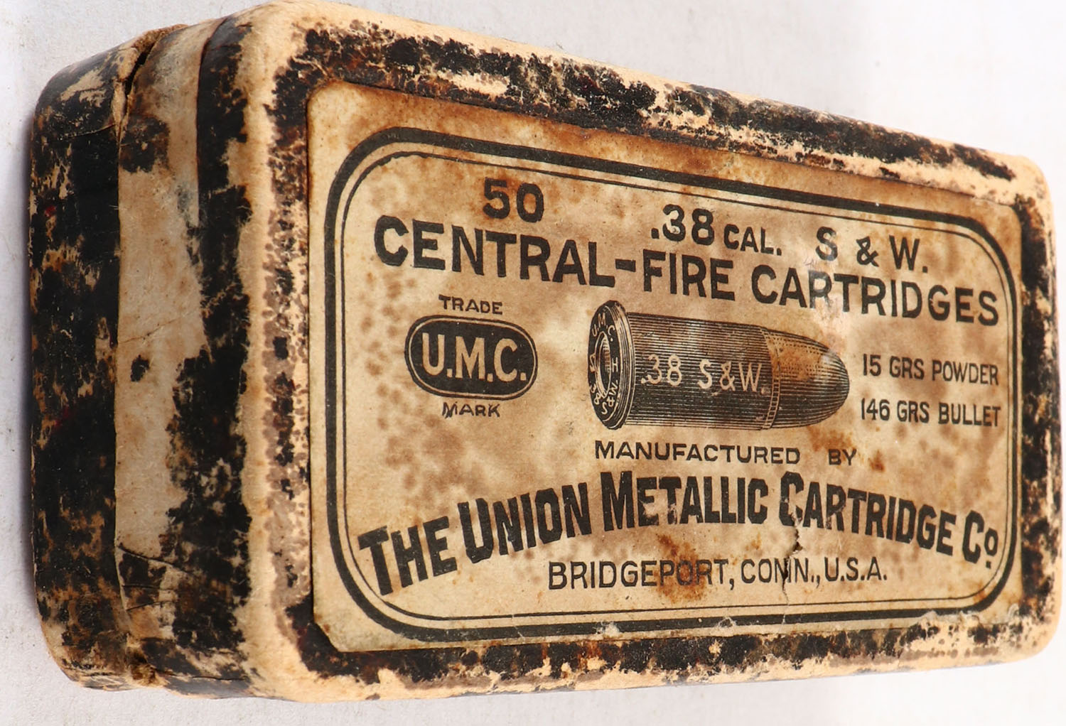 UMC, Central-Fire Cartridges, .38 Smith & Wesson, 15 Grs Powder, 146 Grs Bullet, Partial 30rds., 2pc. Black mottled box, box is solid with good color, some age soiling & shelf wear, staining to top, some edge & corner wear, top label is intact, side sealing label is gone, ammo is very good. Grade: Good ++ - Value: 8 to 40