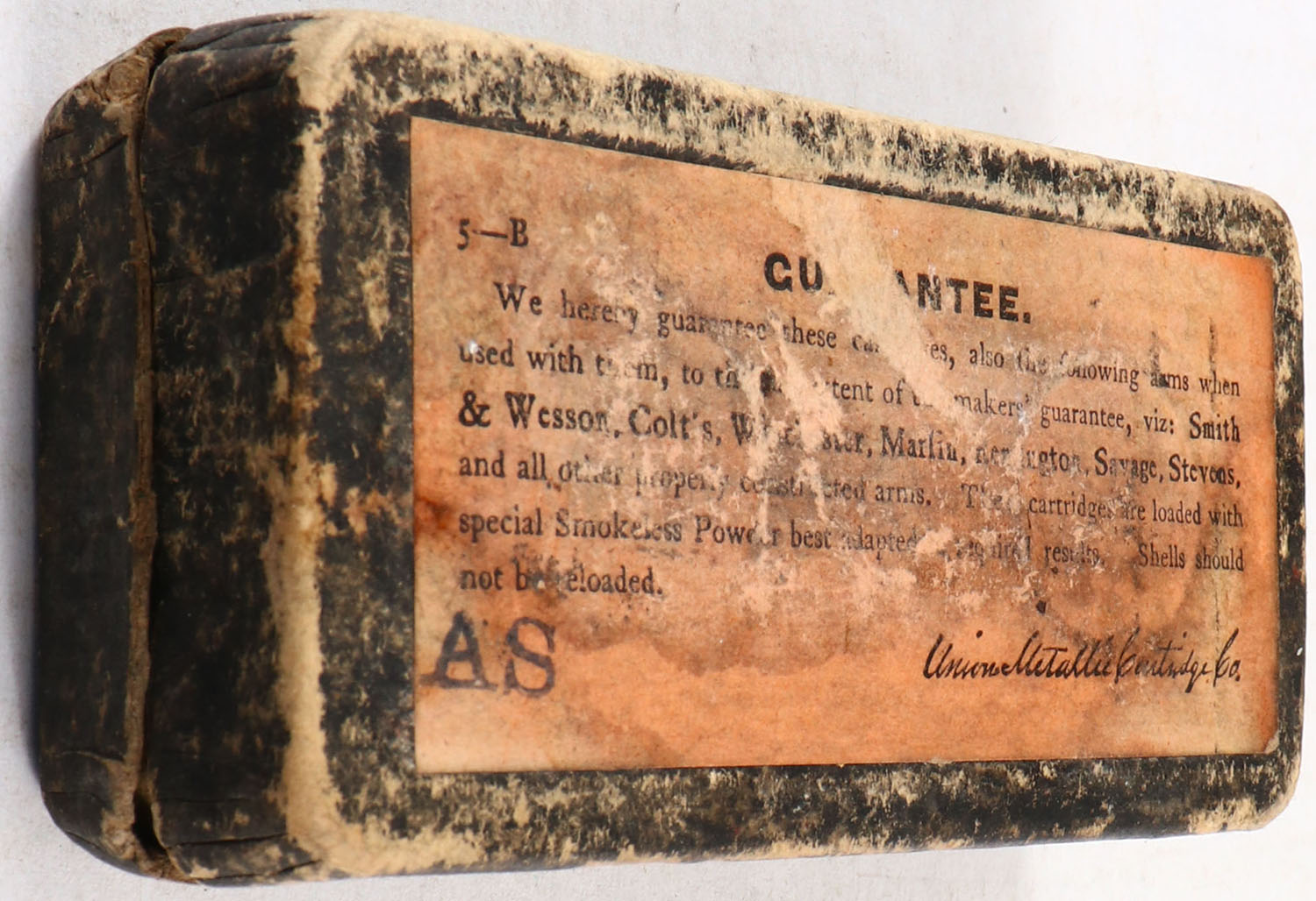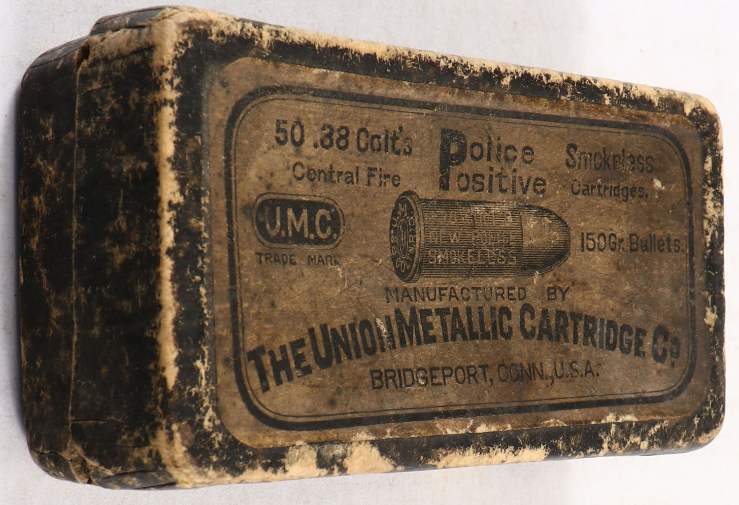 UMC, Central Fire Cartridges, .38 Colt Police Positive, 150 Gr. Bullets, Empty, 2pc. Black mottled box with buff top label, box is solid with fair color, age soiling, some edge & corner wear, side sealing label is gone, top label is intact. Grade: Fair - Value: 2 to 20