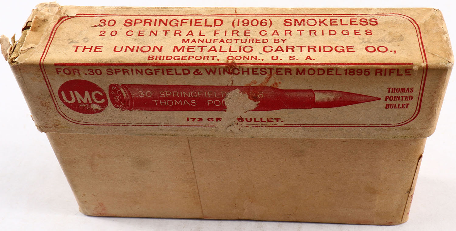 UMC, Central Fire Cartridges, .30 Springfield 1906 (.30-06), 172 Grain Thomas Pointed Bullet, Full, 2pc. Buff box with buff label, box is solid with very good to excellent color, very minor age soiling, scuff on front, minor corner wear, edges are mostly crisp, label is intact, ammo is good. Grade: Very Good ++ - Value: 20 to 60