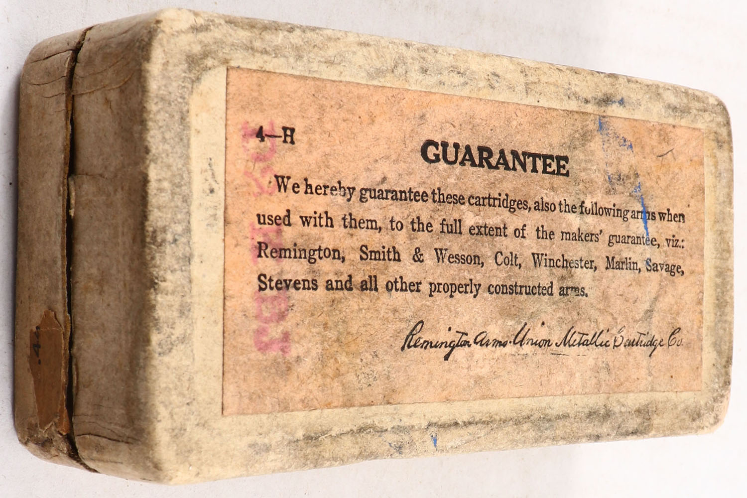 REM-UMC, Rim Fire Cartridges, .44 Henry Flat, Full, 2pc. Buff box with green top label, side sealing label is gone, very good color, some age soiling, very minor corner wear, edges are mostly crisp, top label is intact, ammo is very good. Grade: Very Good + - Value: 800 to 2400
