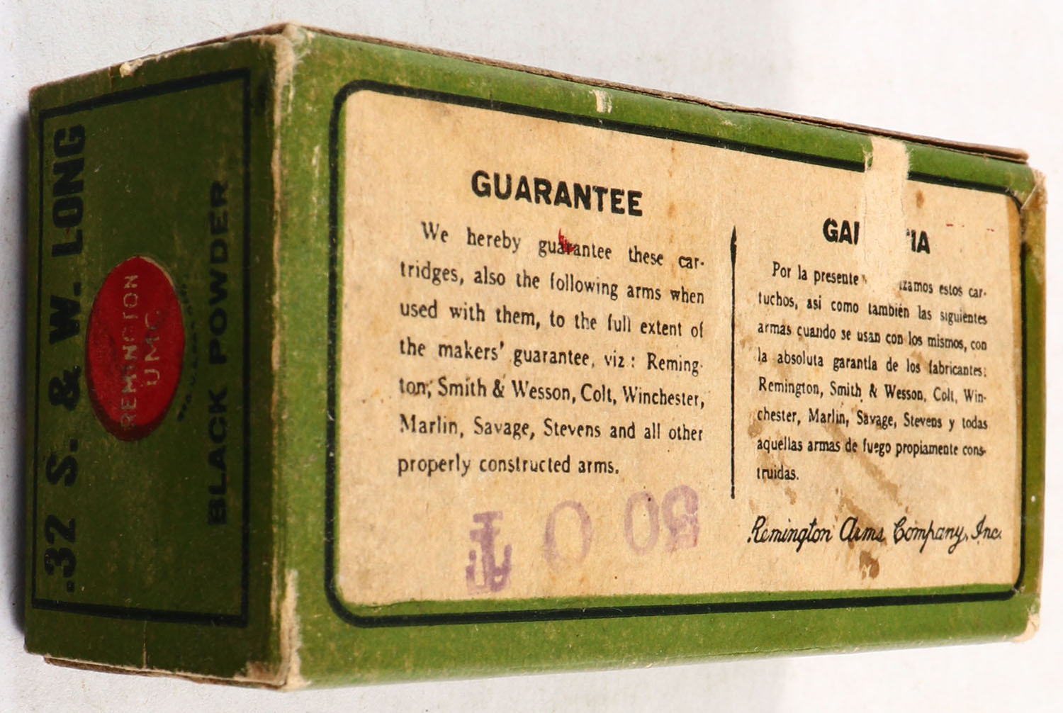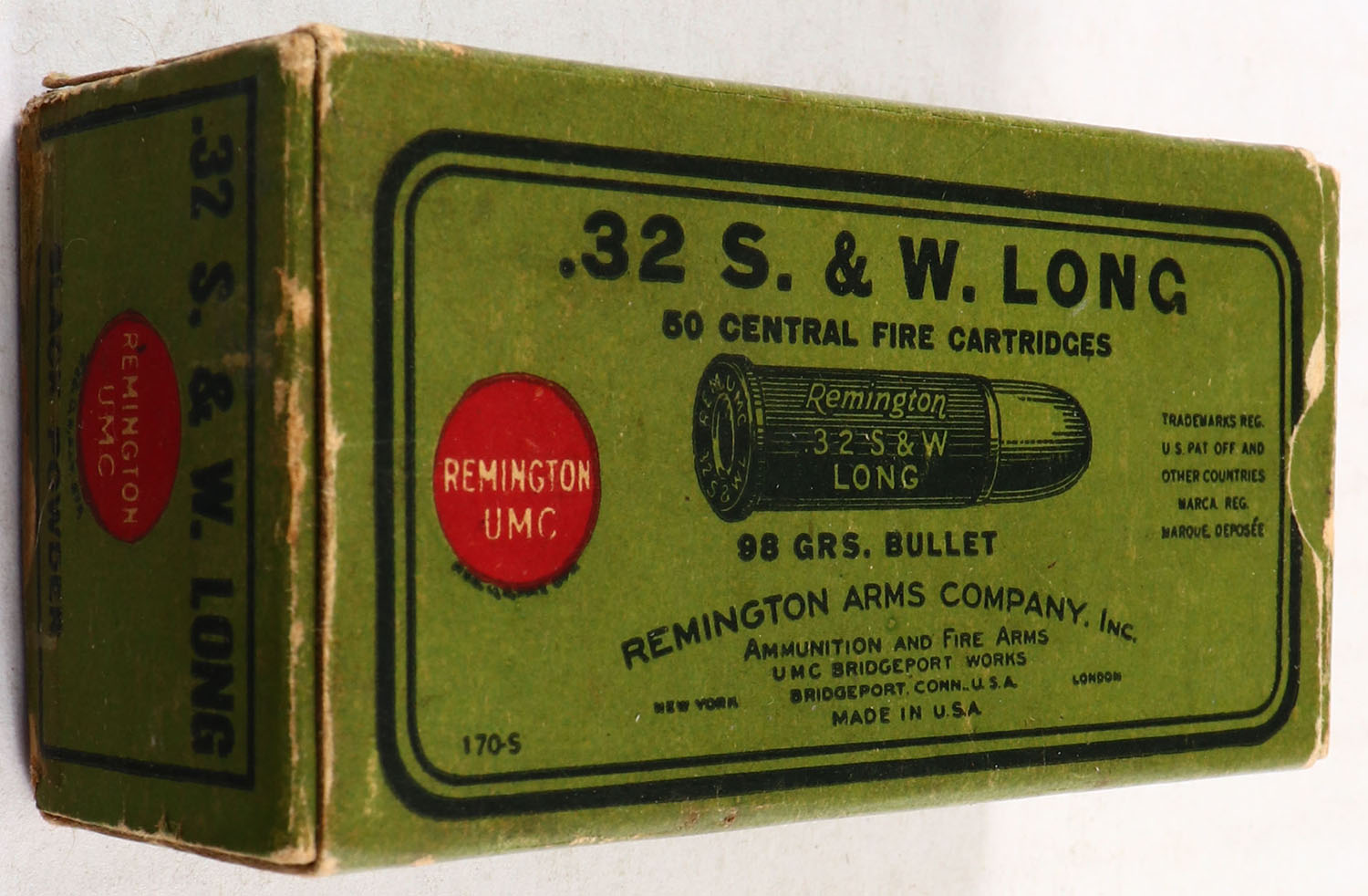 REM-UMC, Central Fire Cartridges, .32 Smith & Wesson Long, 98grs. Bullet, Black Powder, Full of mixed ammo, 1pc. Green black & red box, box is solid with excellent color, very minor age soiling, minor corner wear, edges are mostly crisp, end flaps are solid, ammo is excellent. Grade: Excellent - Value: 10 to 50