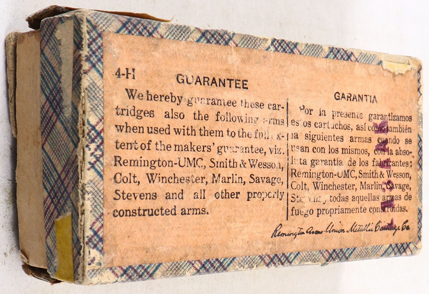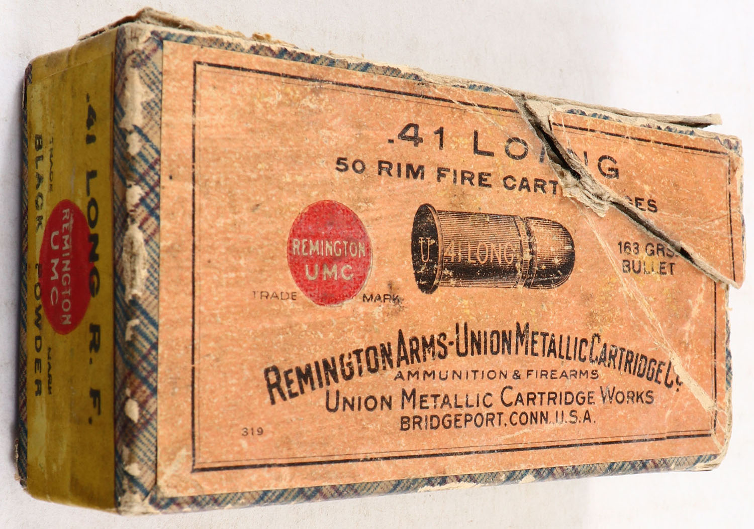 REM-UMC, Rim Fire Cartridges, .41 Long Rim Fire, Full, 2pc. Purple fabric box with orange top & yellow side sealing labels, box has a torn corner, seam split to top back edge, right end of lid is missing, side sealing label is sealed, very good color, minor age soiling some edge & corner wear, side sealing label is 90% intact. Grade: Good + - Value: 40 to 200