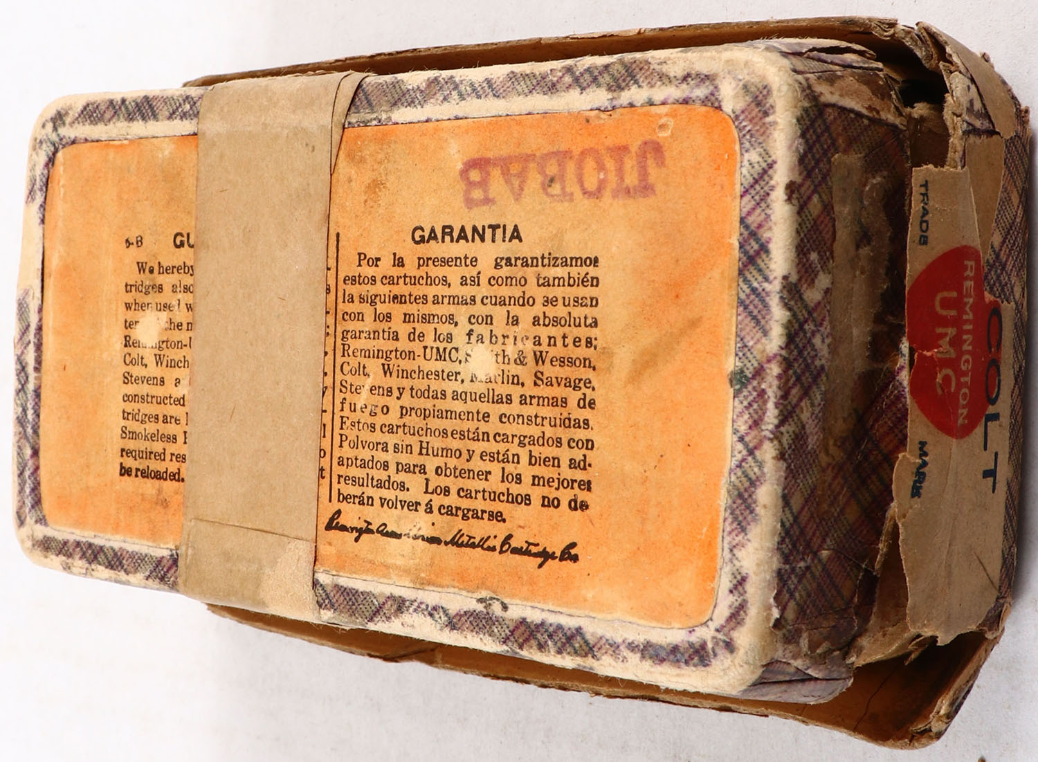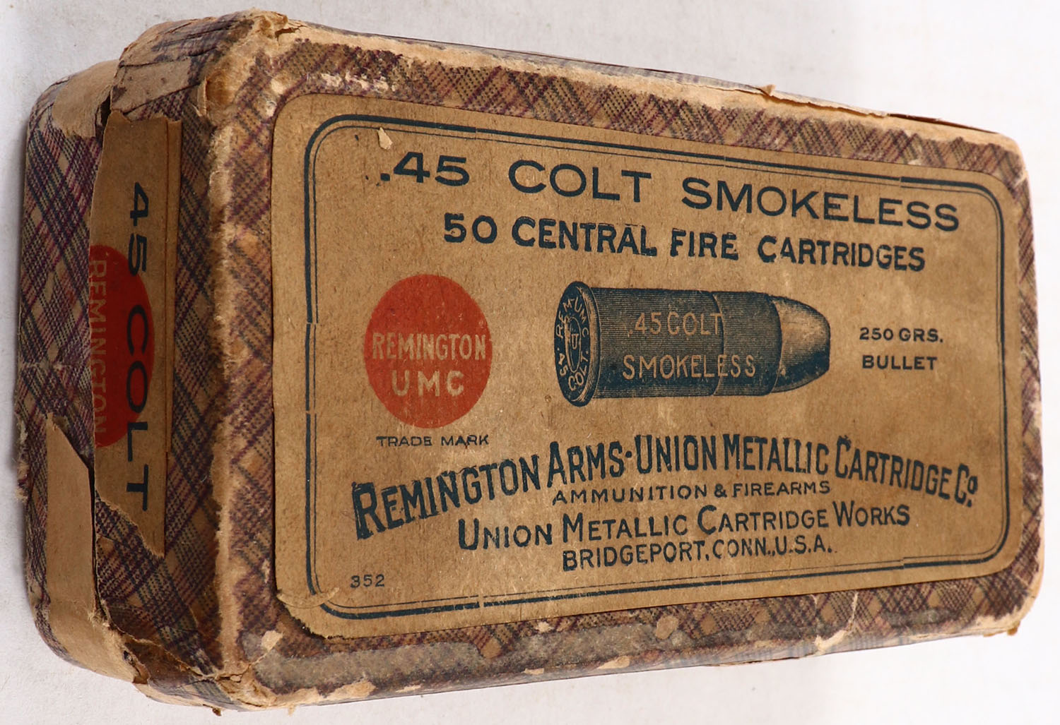 REM-UMC, Central Fire Cartridges, .45 Colt, 250 Grs. Bullet, Full, 2pc. Purple fabric box with buff top & side sealing labels, box is solid with good color, age soiling, minor shelf wear, some corner wear, minor edge wear, vertical seam splits to both right end corners of lid, side sealing label is 50% intact, ammo is good. Grade: Good + - Value: 20 to 60