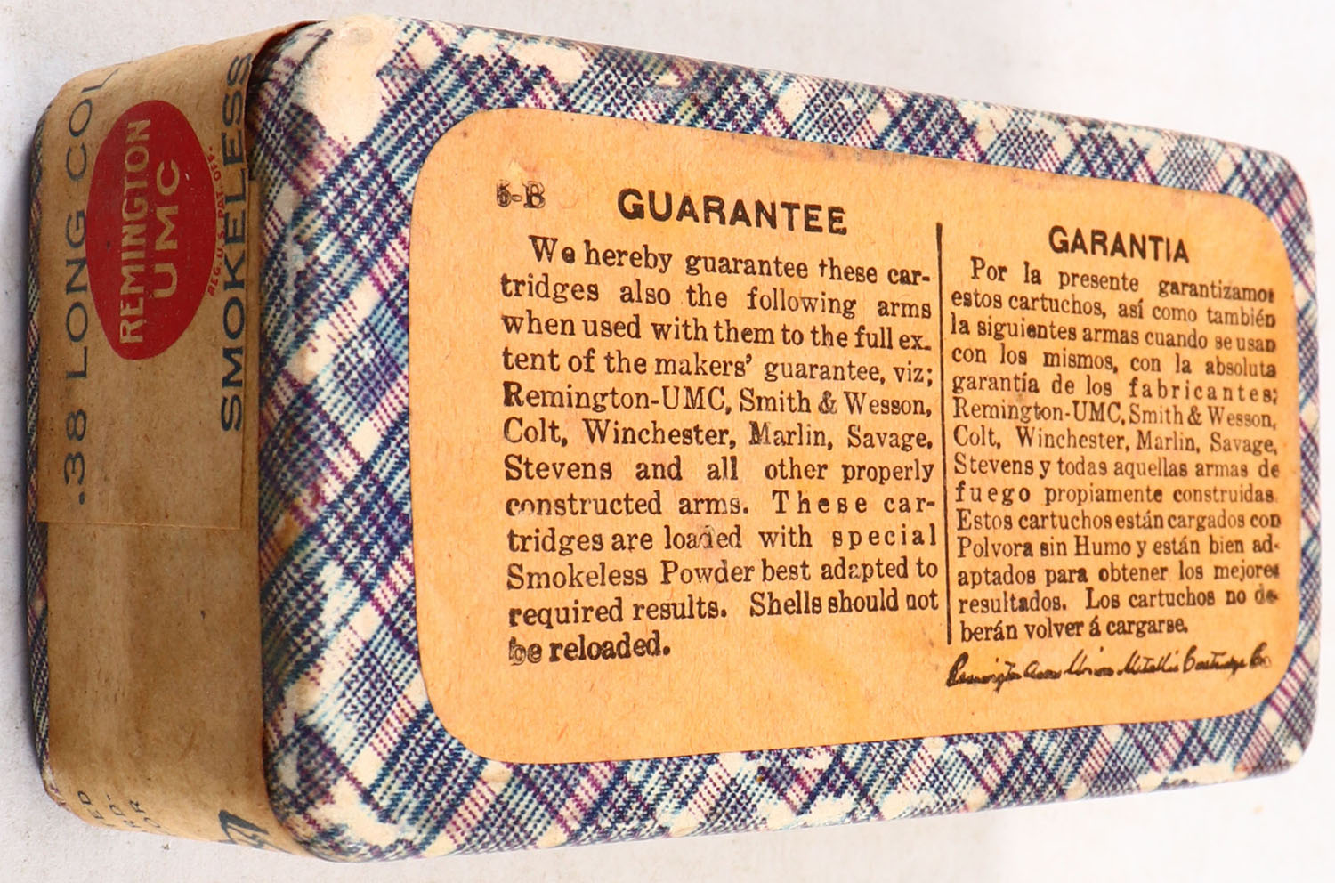 REM-UMC, Central Fire Cartridges, .38 Long Colt, 148 Grs. Bullet, FULL & SEALED, 2pc. Purple fabric box with buff top & side sealing labels, box is solid with very good to excellent color, very minor age soiling, some shelf wear, very minor corner wear, edges are mostly crisp, labels are intact. Grade: Very Good ++ - Value: 40 to 120