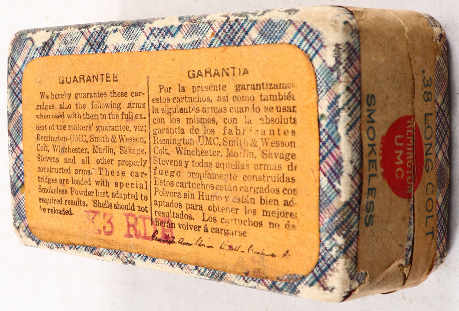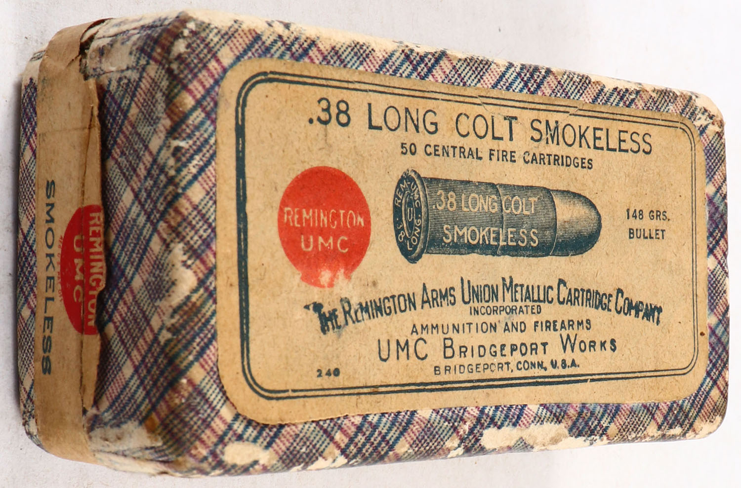 REM-UMC, Central Fire Cartridges, .38 Long Colt, 148 Grs. Bullet, Full, 2pc. Purple fabric box with buff top & side sealing labels, box is solid with very good color, minor age soiling, some edge & corner wear, side sealing label is 90% intact, ammo is excellent. Grade: Very Good + - Value: 20 to 60