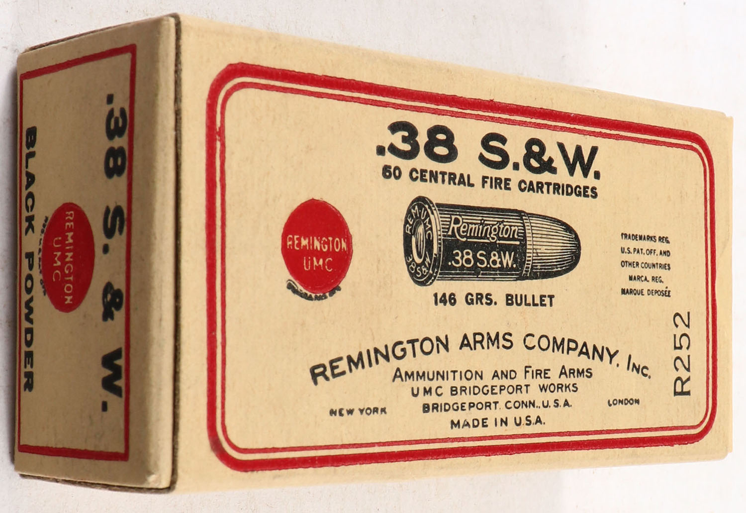 REM-UMC, Central Fire Cartridges, .38 Smith & Wesson, 146 Grs. Bullet, Partial 49rds., 1pc. Buff black & red box, box is MINT with minty color, corners are sharp, edges are crisp, end flaps are solid, ammo is excellent. Grade: MINT - Value: 40 to 120