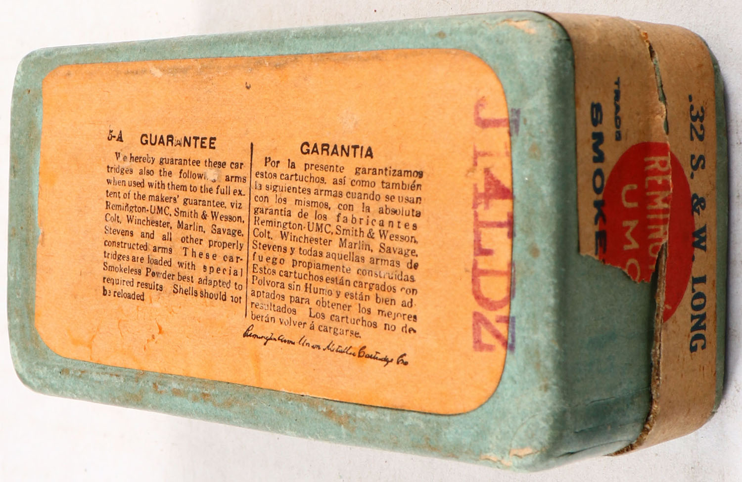 REM-UMC, Central Fire Cartridges, .32 Smith & Wesson Long, 98 Grs. Bullet, Full, 2pc. Blue box with buff top & side sealing labels box is solid with very good to excellent color, minor age soiling, very minor staining on top, very minor corner wear, edges are crisp, side sealing label is 80% intact, ammo is very good. Grade: Very Good ++ - Value: 30 to 90