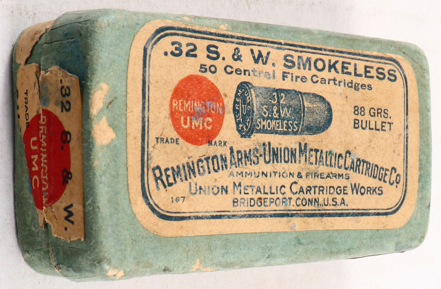 REM-UMC, Central Fire Cartridges, .32 Smith & Wesson, 88 Grs. Bullet, Partial 36rds, 1pc. Blue box with buff top & side sealing labels, box is solid with excellent color, very minor age soiling & shelf wear, minor edge & corner wear, side sealing label is 70% intact, ammo is excellent. Grade: Very Good + - Value: 10 to 50