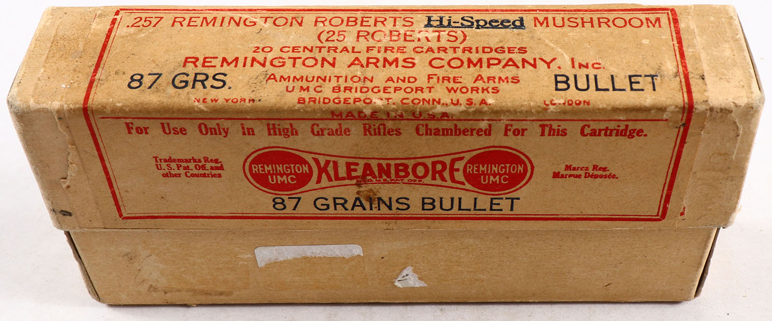 REM-UMC, Central Fire Cartridges, .257 Remington Roberts (.25 Roberts), Hi-Speed Mushroom, 87 Grs. Bullet, Empty (Full of fired brass), 2pc. Buff box with buff label, box is solid with excellent color, very minor age soiling & shelf wear, very minor edge & corner wear, label is intact, brass is excellent. Grade: Very Good + - Value: 4 to 20