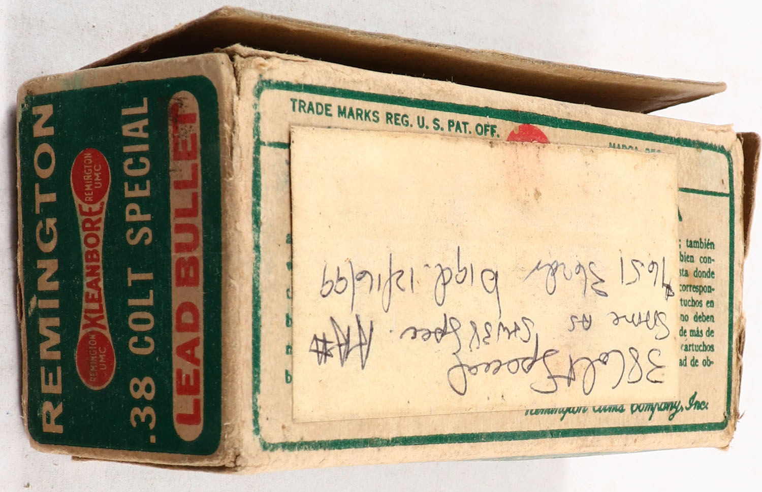 Remington, Kleanbore, .38 Colt Special, 158 Grain Lead Bullet, Partial 36rds, 1pc. Green buff & red dogbone box, box has seam splits, some age soiling & shelf wear, some corner wear, very minor edge wear, end flaps are solid, ammo is good. Grade: Good - Value: 8 to 30