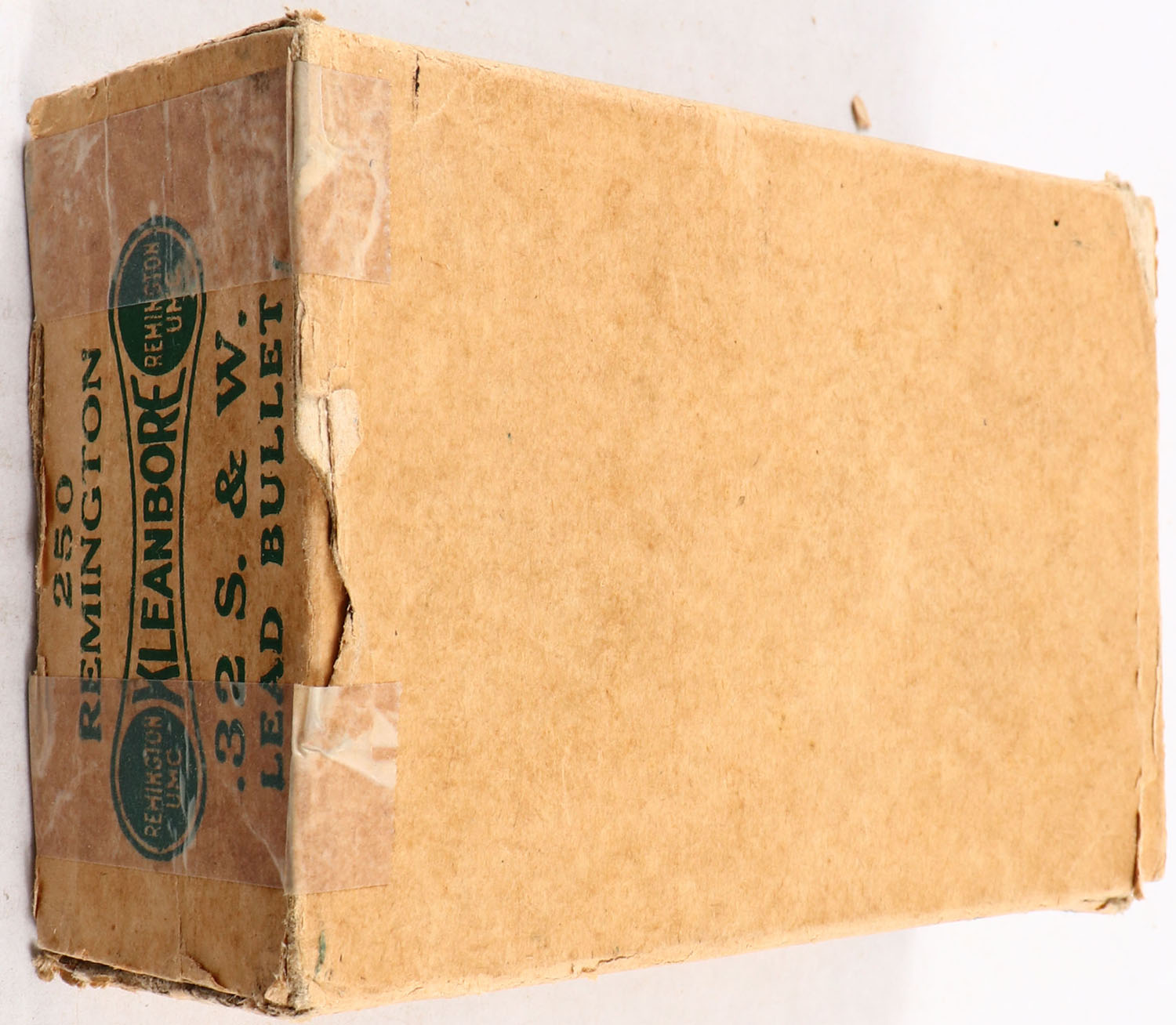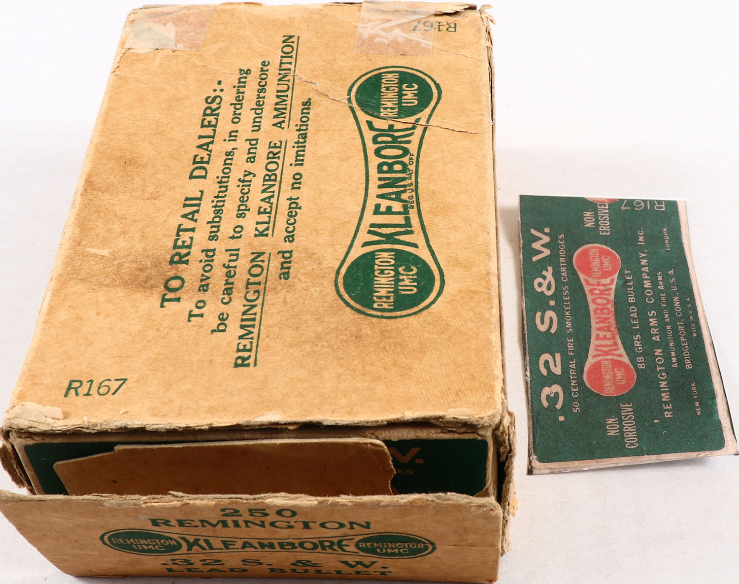 Remington, Lot of 5, Kleanbore, .32 S.&W., 88 Gr. Lead Bullet, Full Case 250rds, 1pc. Green red & white boxes, boxes are minty, case has edge & corner wear. Grade: Excellent - Value: 60 to 120